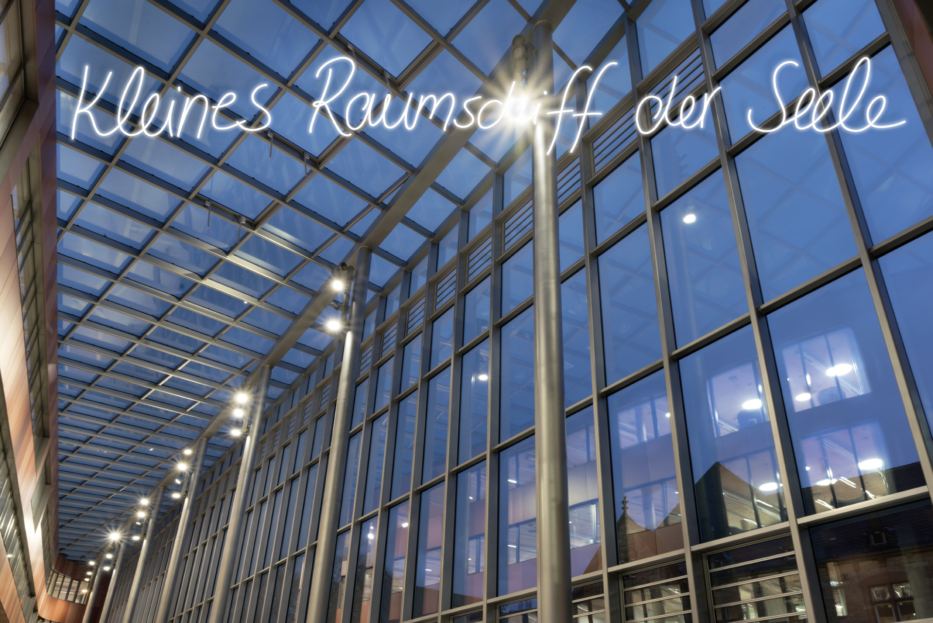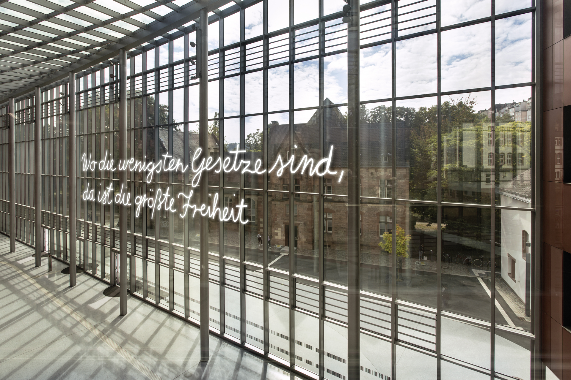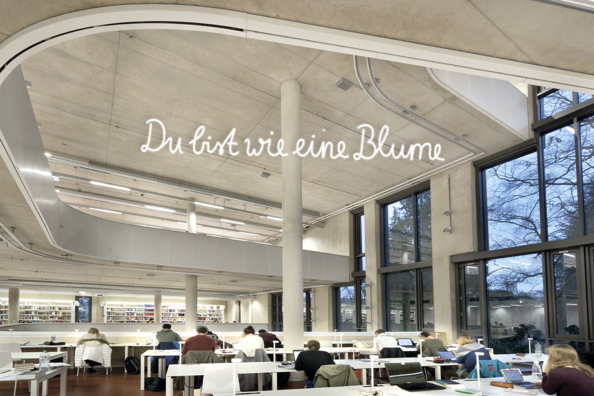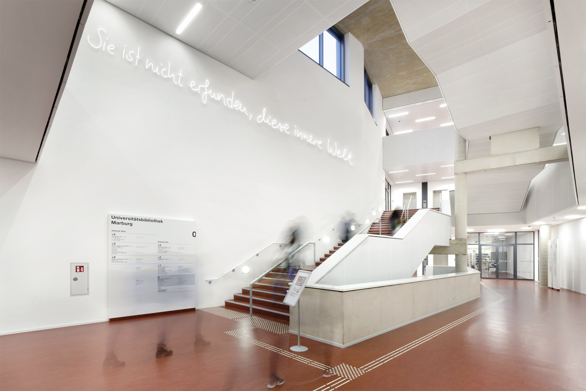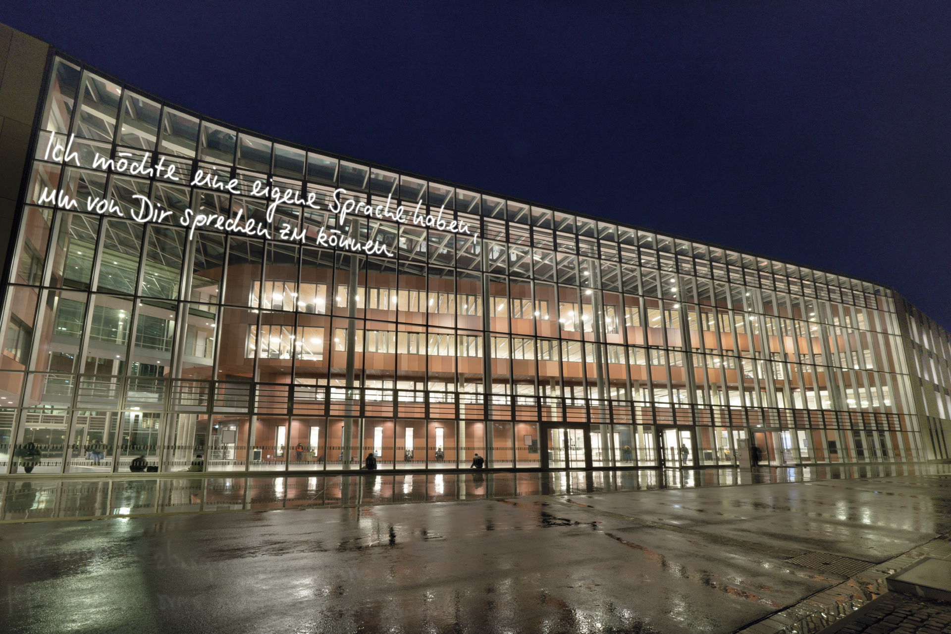 Für den Neubau der Universitätsbibliothek in Marburg entstand der Entwurf für die Neonarbeit Die Sprache ist das Haus des Seins. 14 Botschaften von Dichter_innen und Denker_innen, die einmal in Marburg gelebt und gearbeitet haben, sollen über und am Gebäude verteilt werden und Kontakt mit den Nutzer_innen aufnehmen. Handgeschrieben von Studierenden schaffen sie einen generationsübergreifenden Transfer von Wissen, Emotion und Poesie.