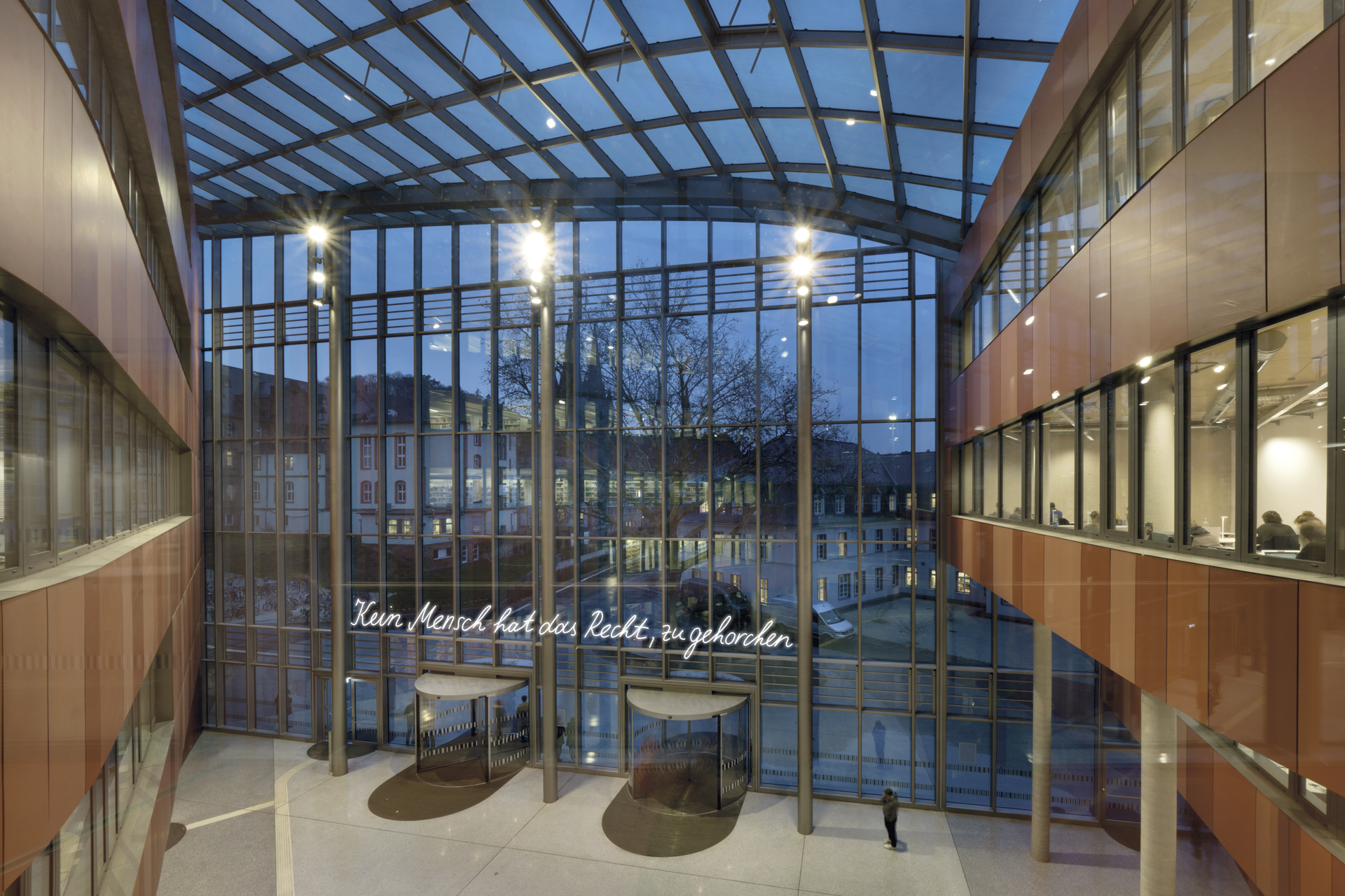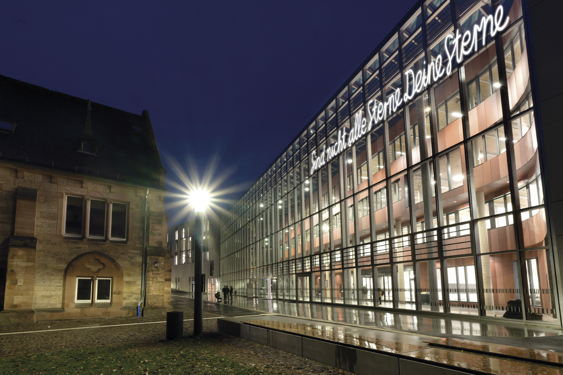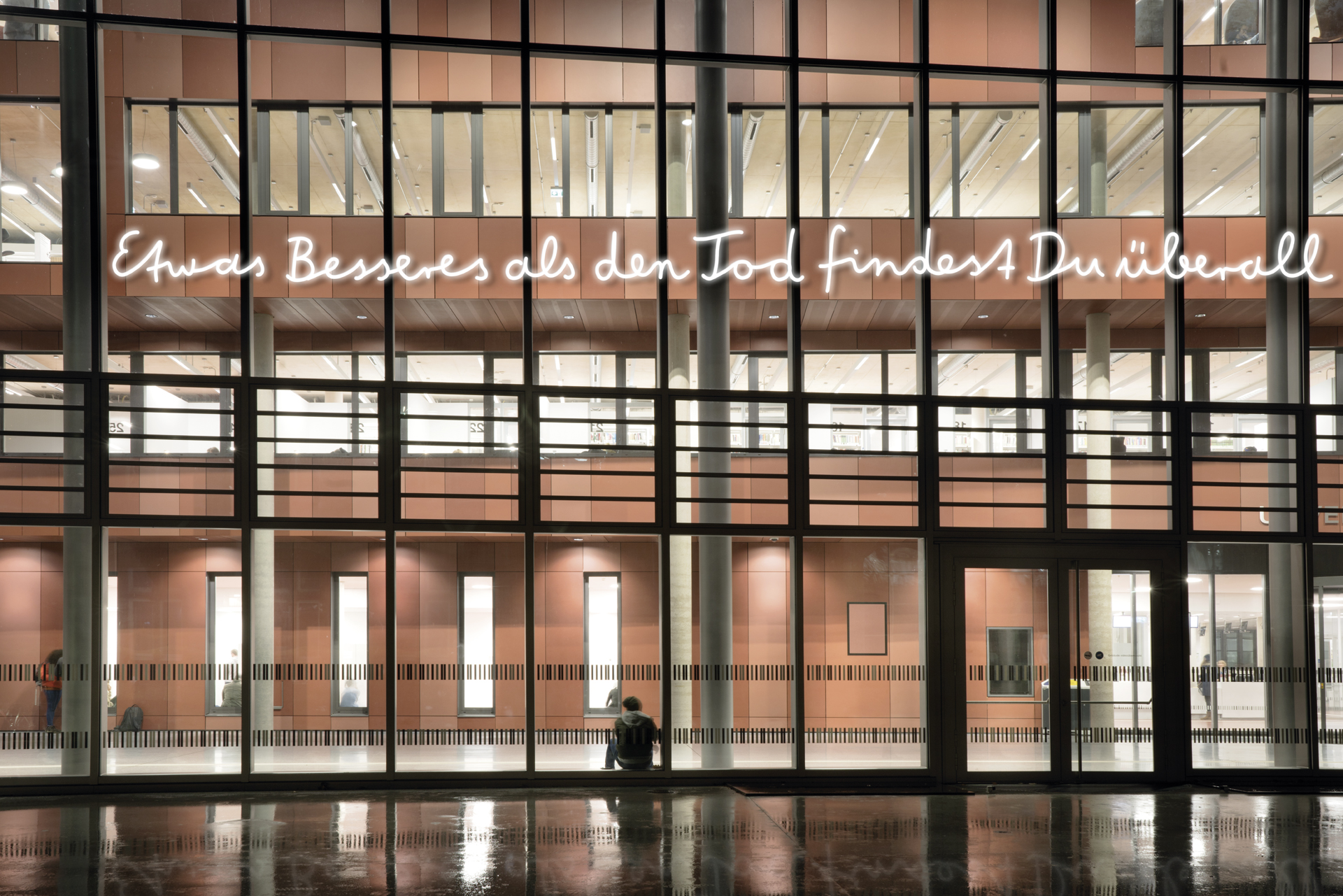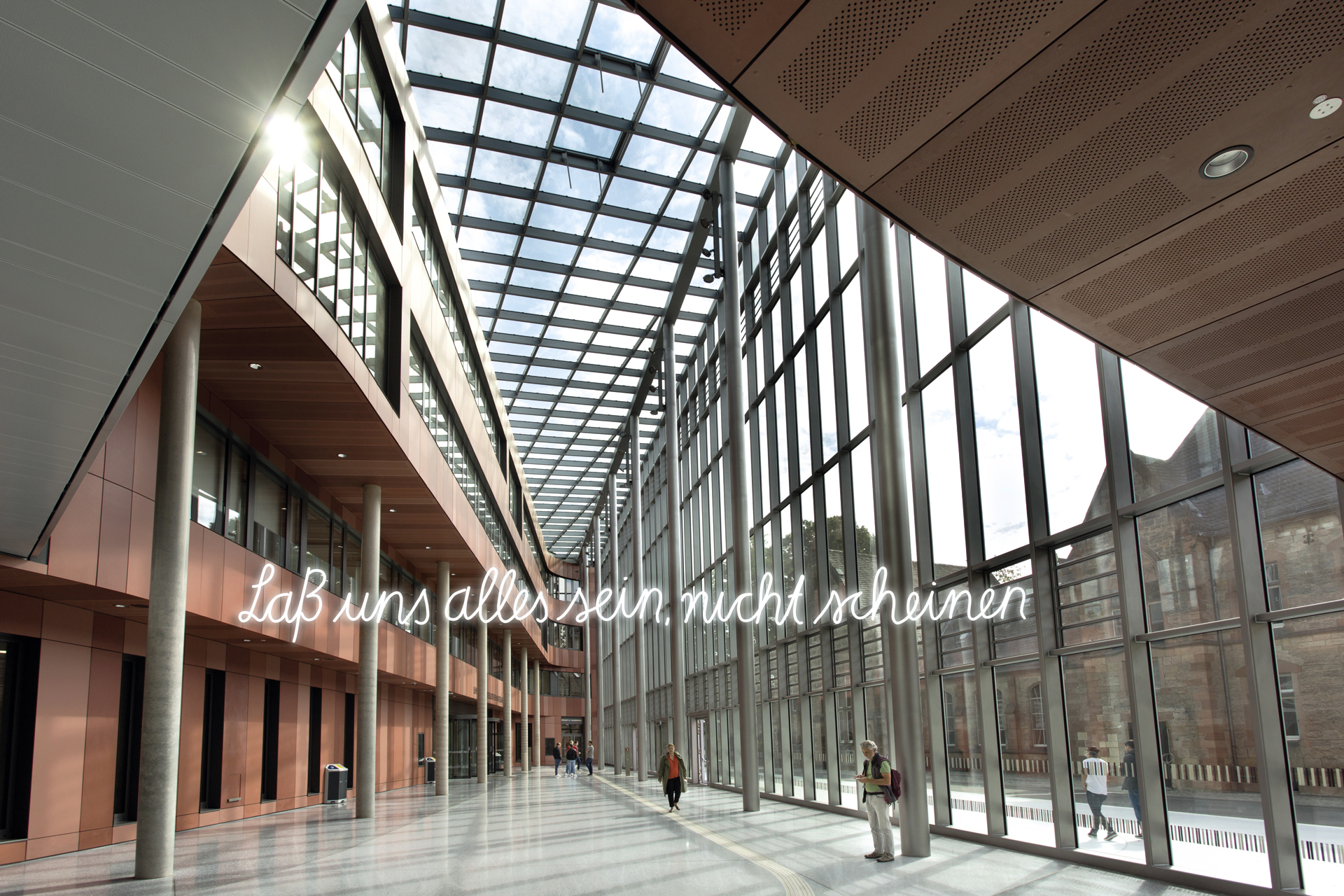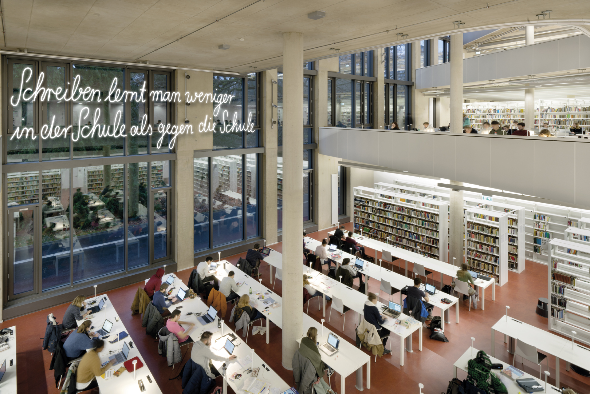 Für den Neubau der Universitätsbibliothek in Marburg entstand der Entwurf für die Neonarbeit Die Sprache ist das Haus des Seins. 14 Botschaften von Dichter_innen und Denker_innen, die einmal in Marburg gelebt und gearbeitet haben, sollen über und am Gebäude verteilt werden und Kontakt mit den Nutzer_innen aufnehmen. Handgeschrieben von Studierenden schaffen sie einen generationsübergreifenden Transfer von Wissen, Emotion und Poesie.