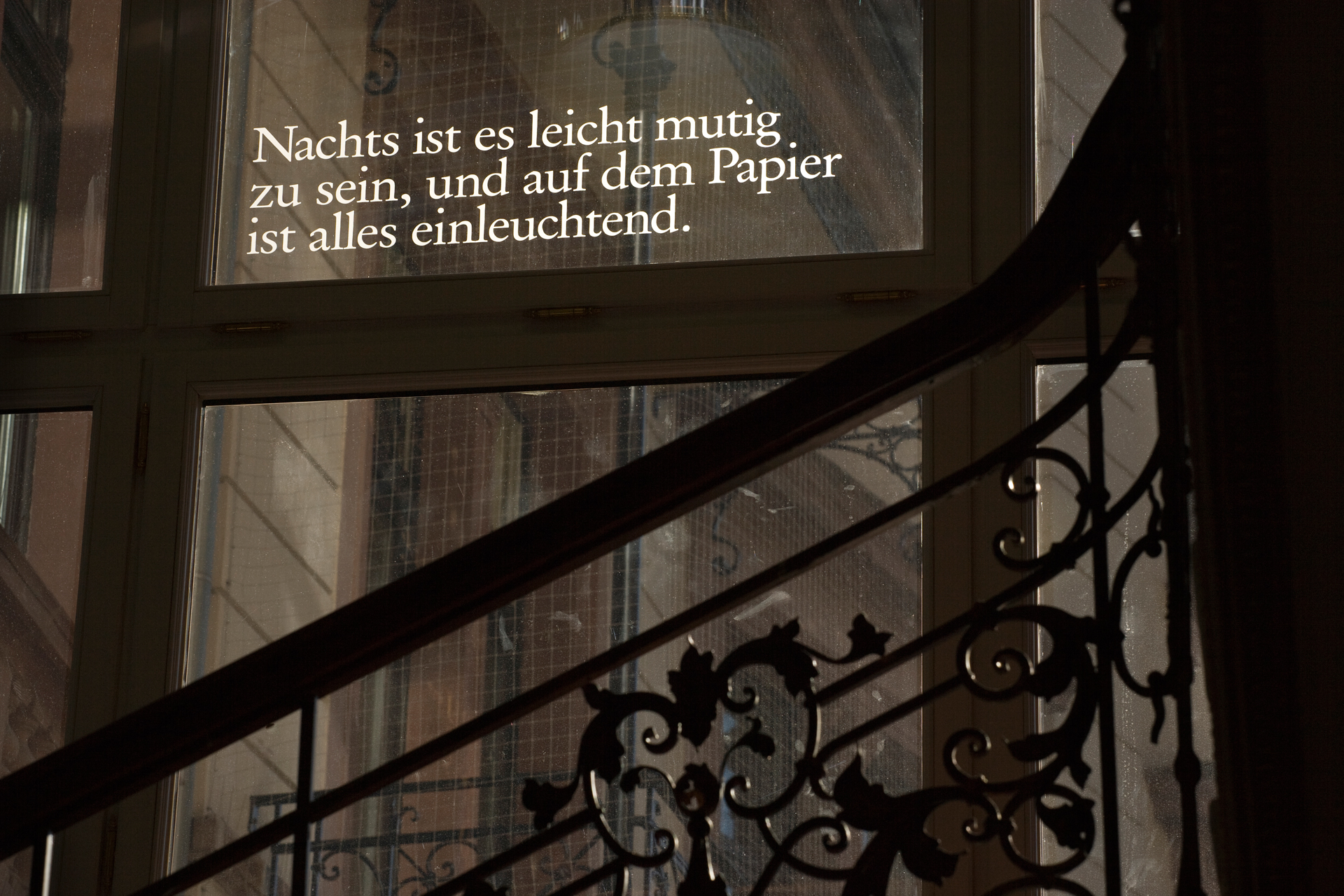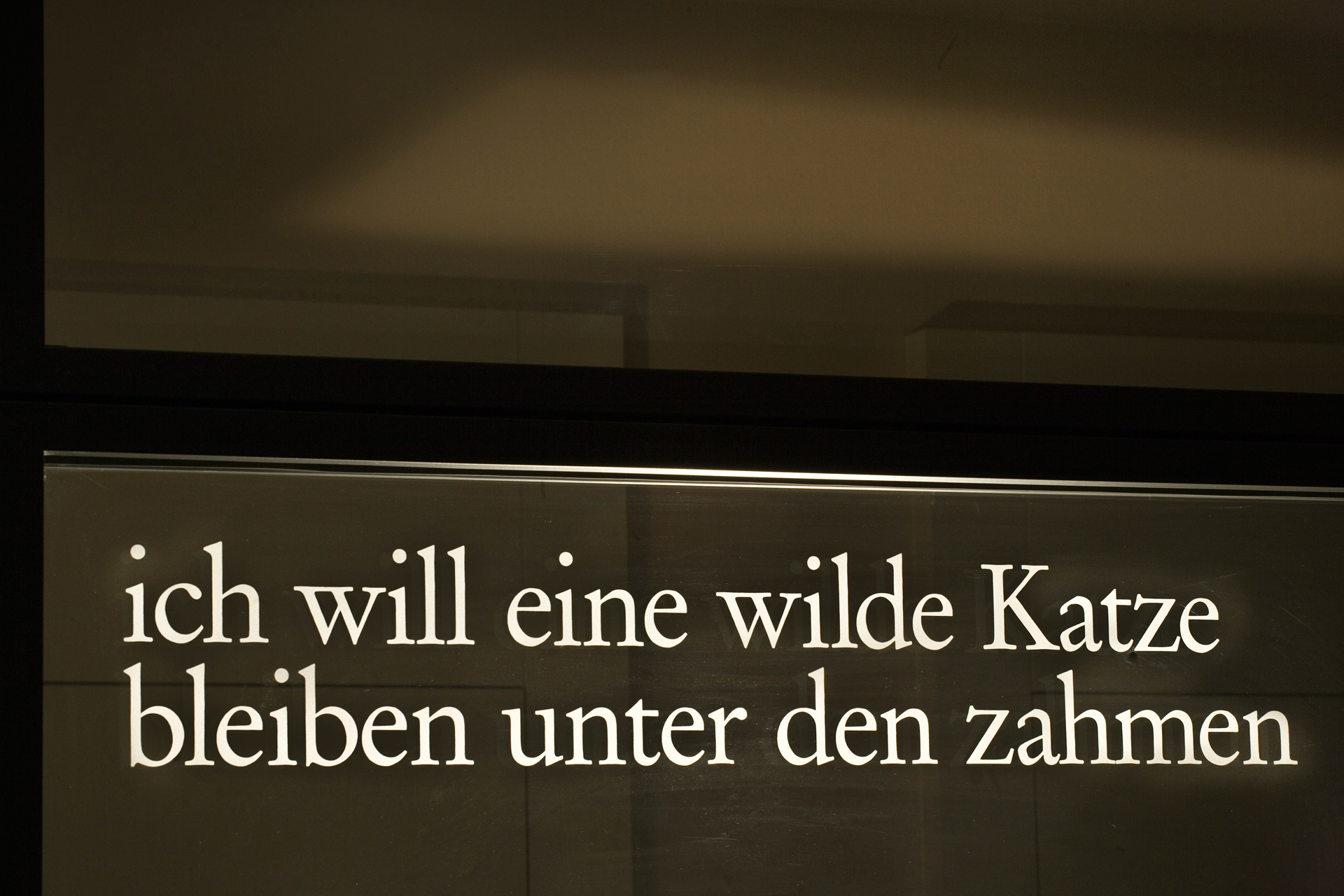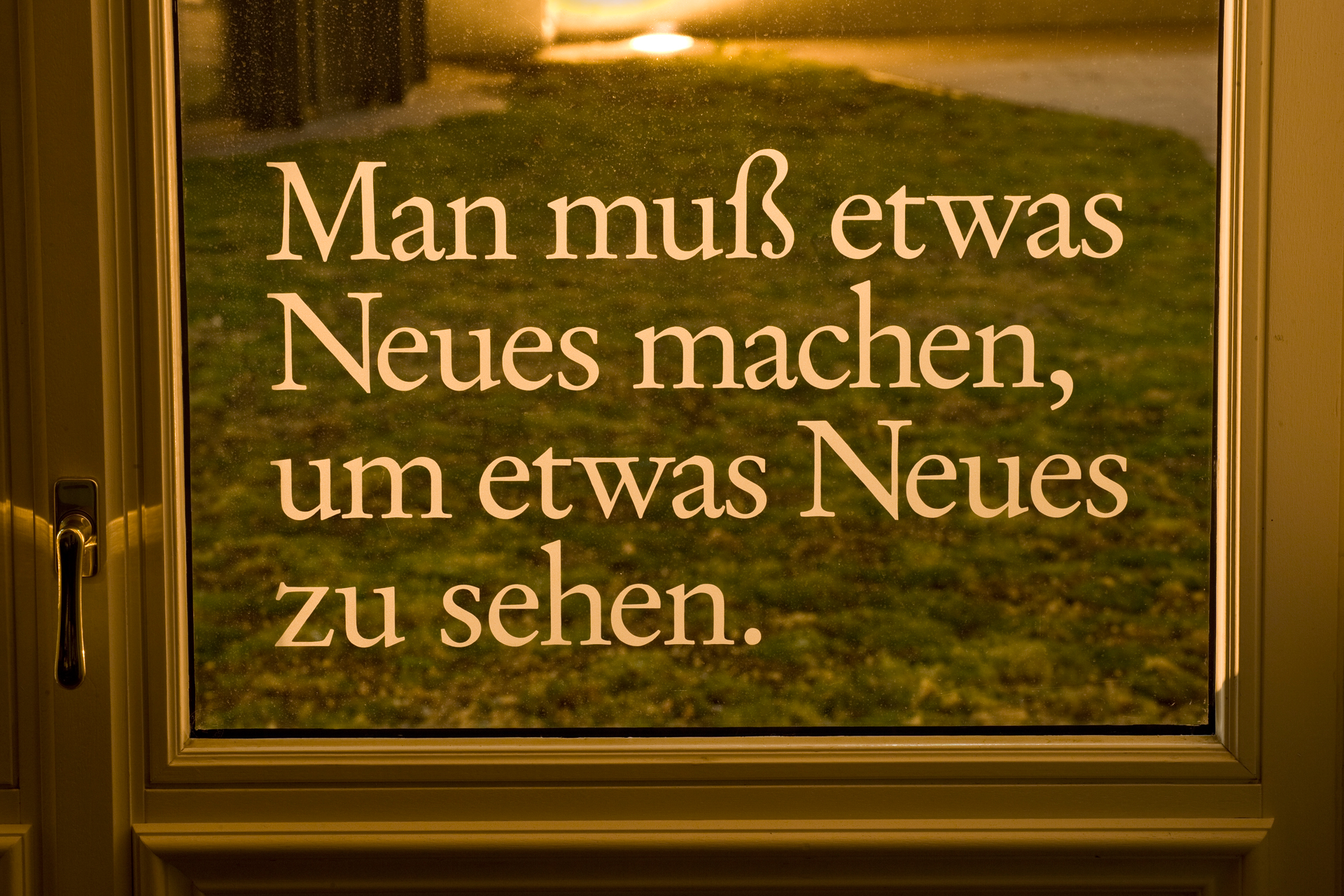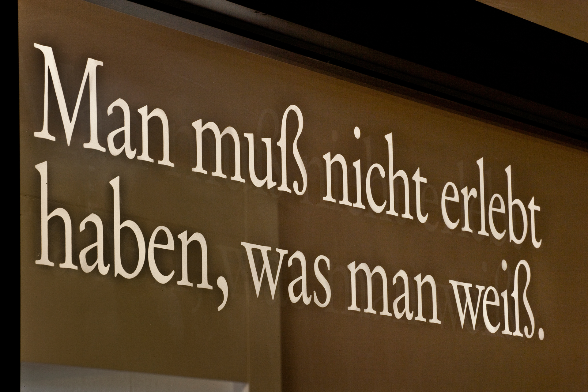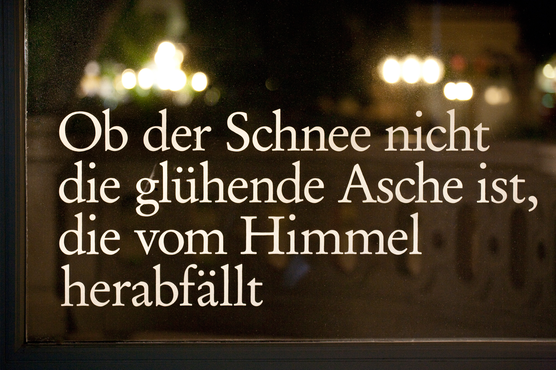 Die Texte wurden mittels Sandstrahltechnik auf die Glasscheiben aufmattiert.
