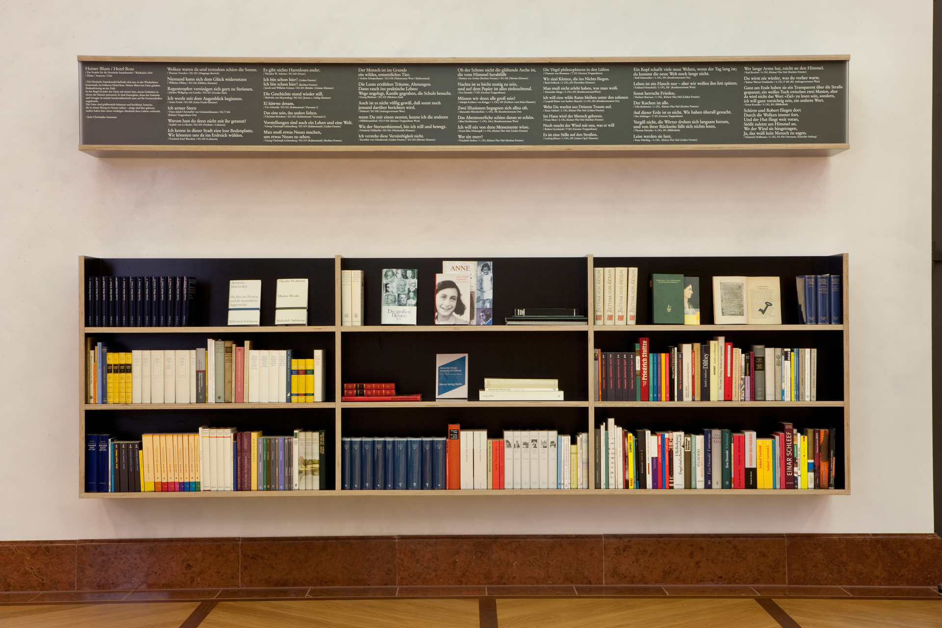 Theodor W. Adorno / Ilse Aichinger / Bettina von Arnim / Ulla Berkéwicz / Clemens von Brentano / Ludwig Börne / Christine Brückner / Georg Büchner / Eva Demski / Wilhelm Dilthey / Einhard / Rainer Werner Fassbinder / Anne Frank / Robert Gernhardt / Johann Wolfgang Goethe / Jacob und Wilhelm Grimm / Hans Jakob Christoffel von Grimmelshausen / Karoline von Günderrode / Peter Härtling / Eckhard Henscheid / Thomas Hettche / Hildebrandslied / Heinrich Hoffmann / Friedrich Hölderlin / Max Horkheimer / Alexander Kluge / Adolph Freiherr von Knigge / Ernst Kreuder / Karl Krolow / Sophie von La Roche / Georg Christoph Lichtenberg / Herbert Marcuse / Malwida von Meysenburg / Alexander Mitscherlich / Franz Mon / Ernst Elias Niebergall / René Pollesch / Leopold Ritter von Sacher-Masoch / Einar Schleef / Uve Schmidt / Arthur Schopenhauer / Rolf Schwendter / Friedrich Stoltze / Thomas Trescher / Friedrich Karl Waechter