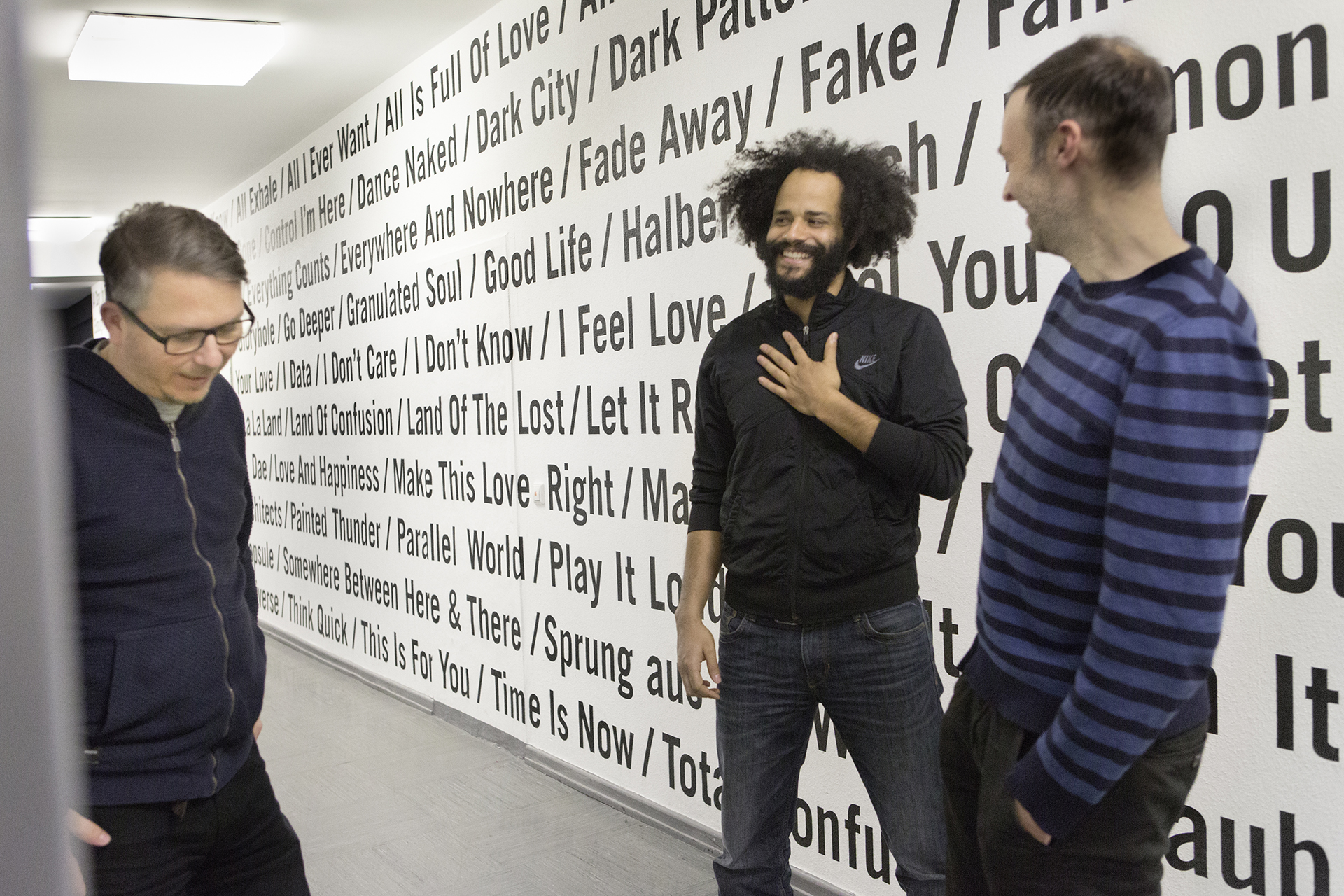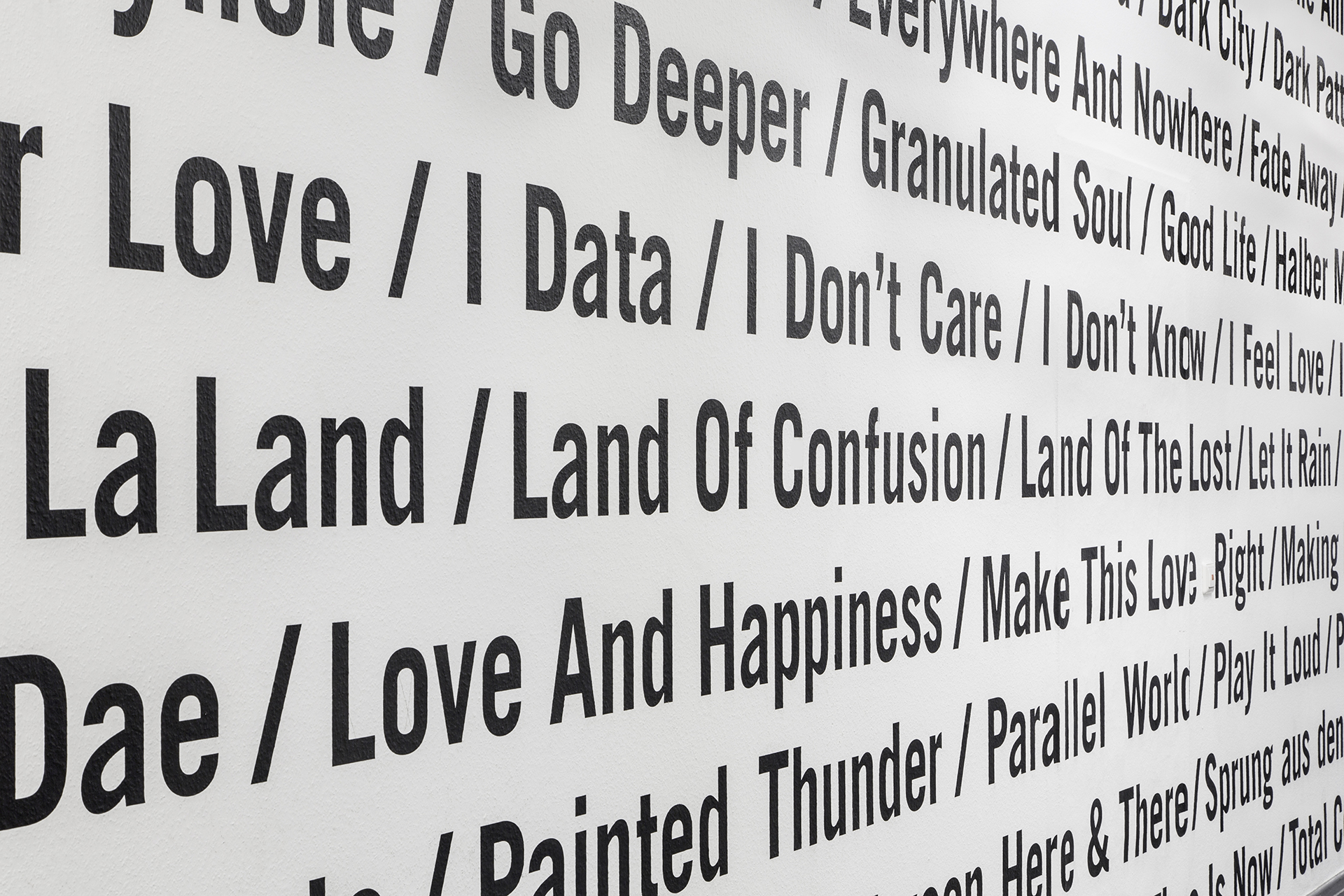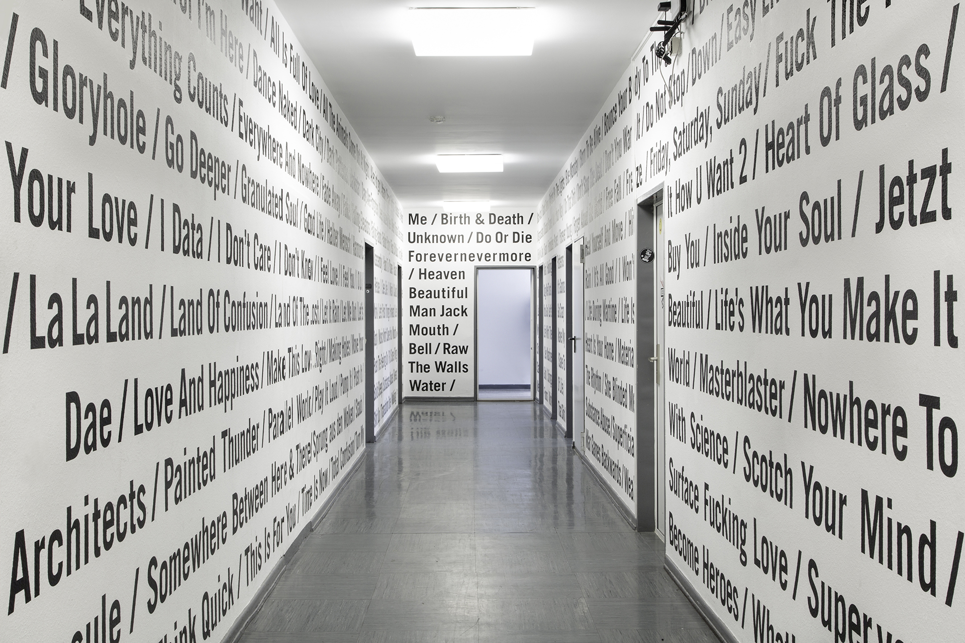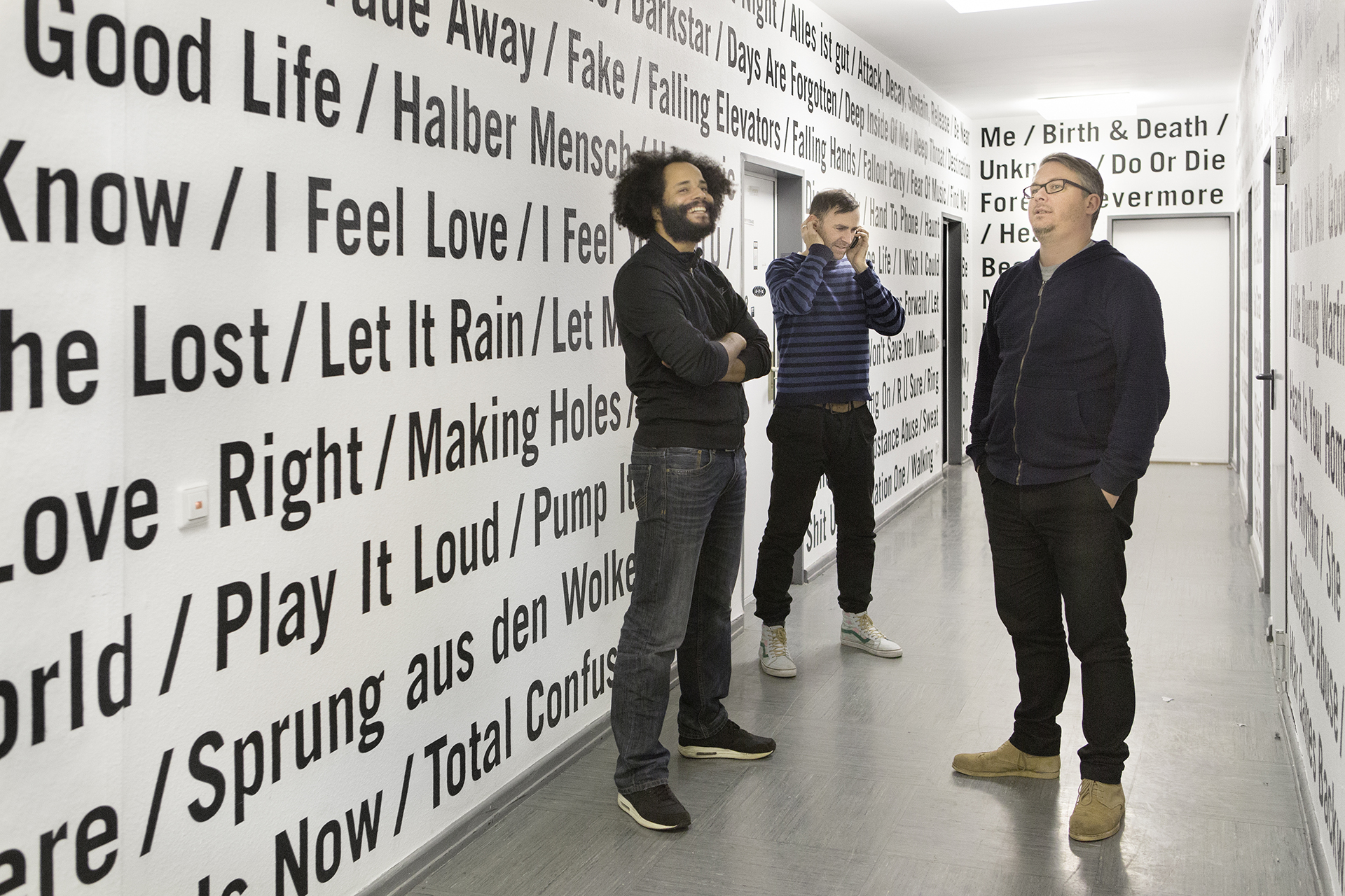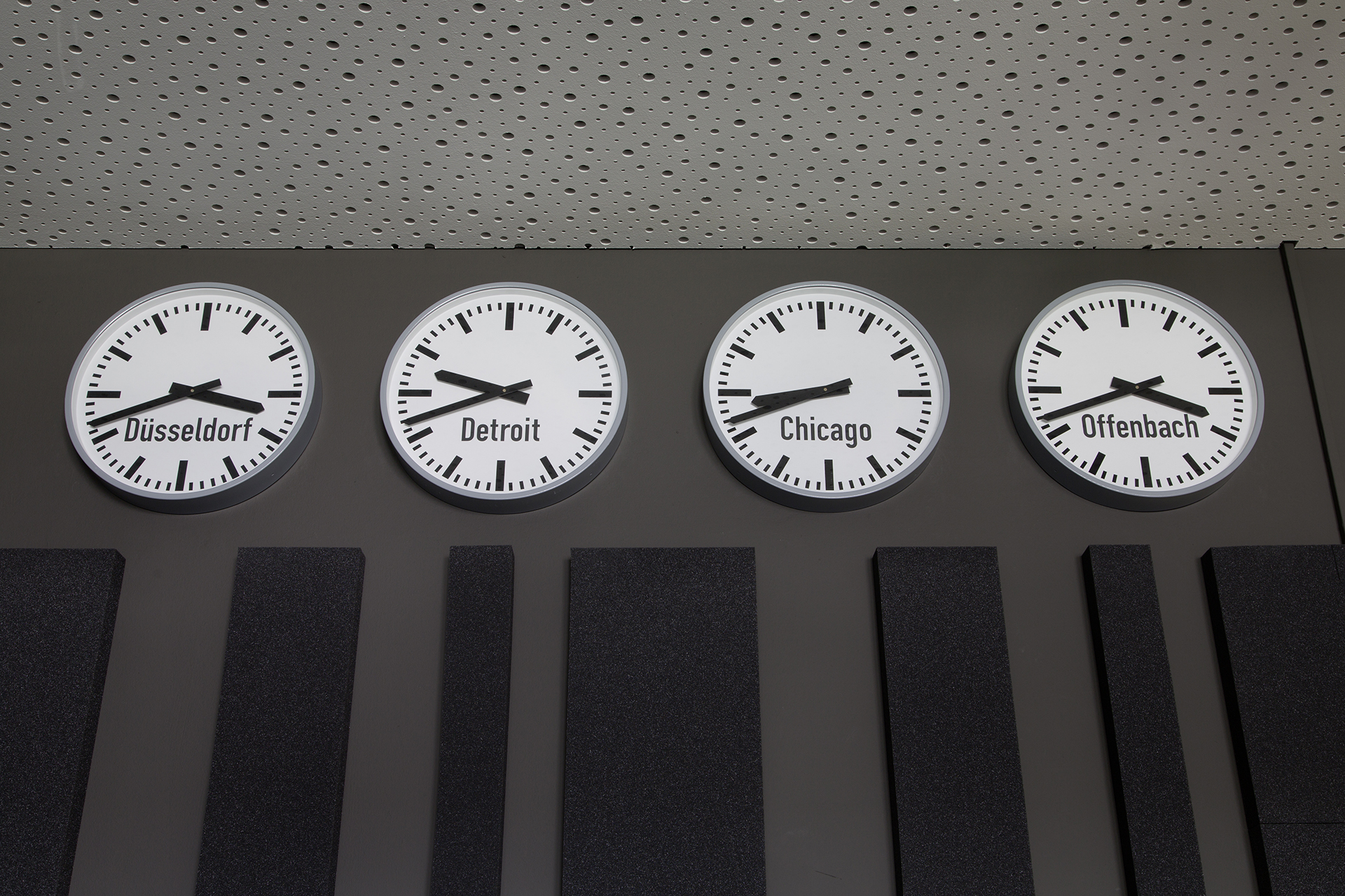 Typografische Wandgestaltung für das Offenbacher Institut für Klangforschung auf der Basis ausgewählter Tracks aus dem Bereich der elektronischen Musik. Vier ortsbezogene Wanduhren für das Tonstudio ergänzen die Installation.