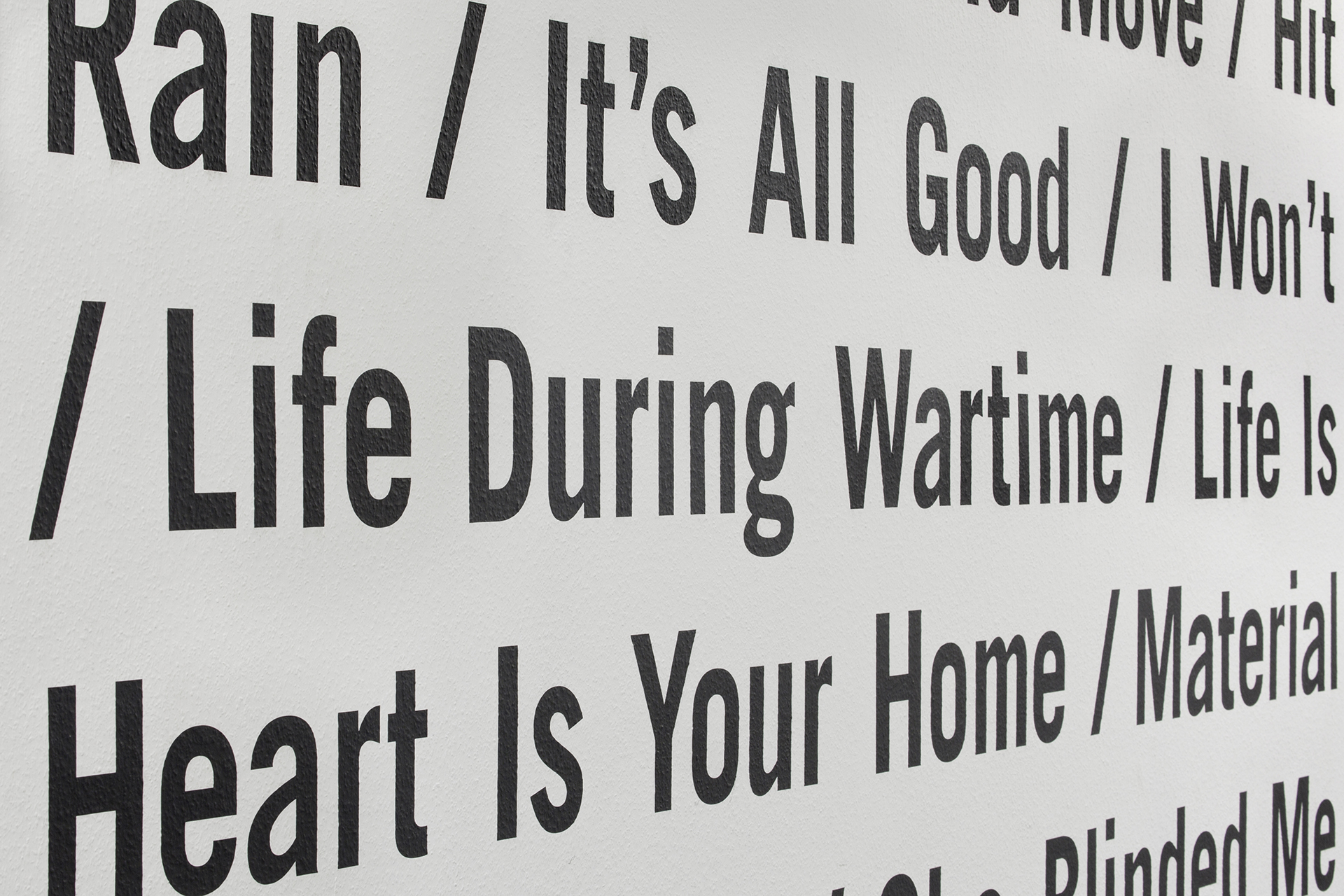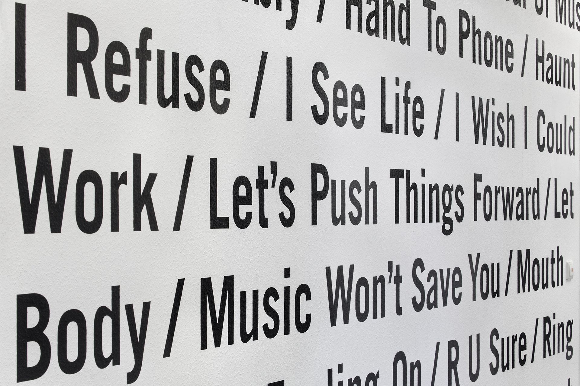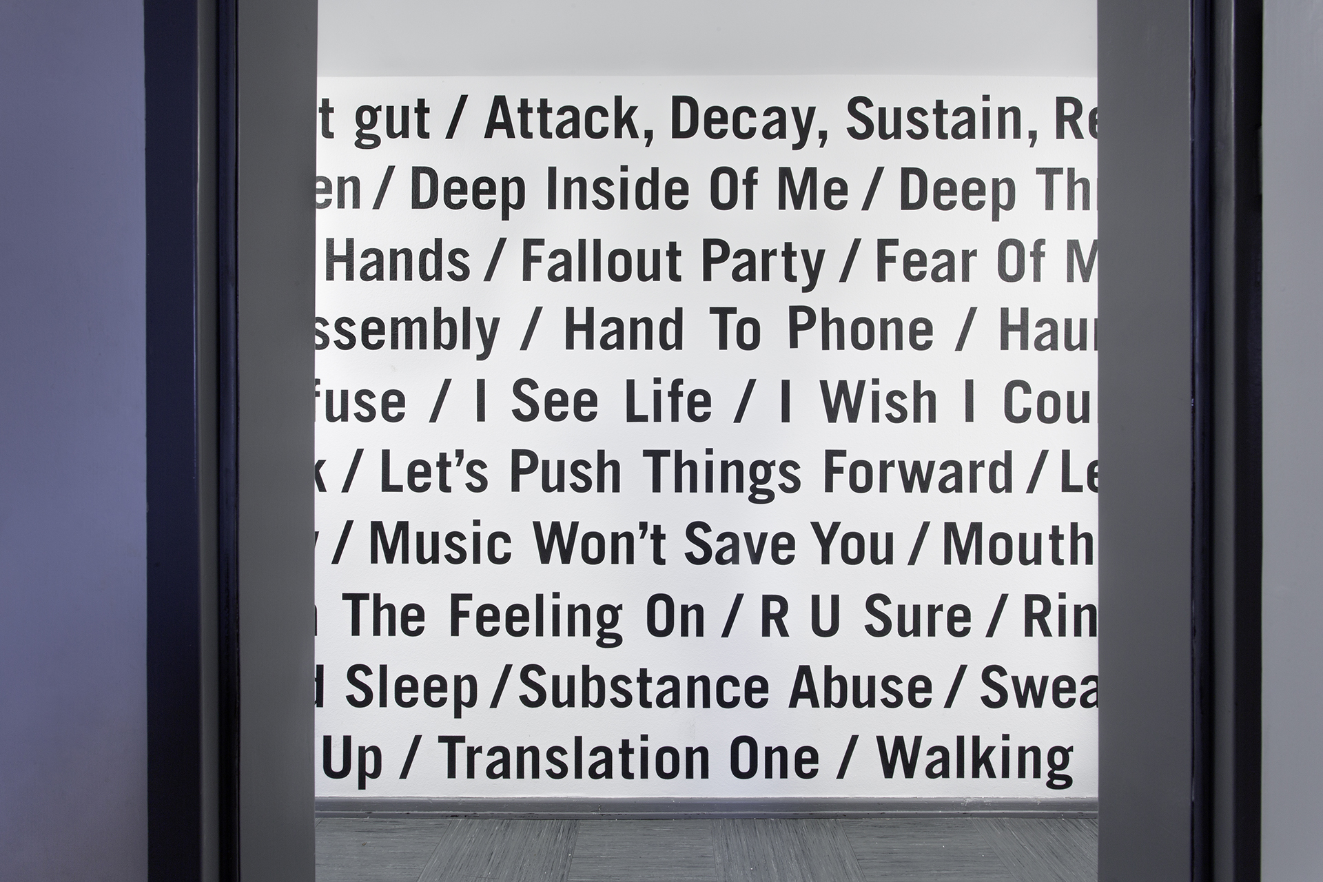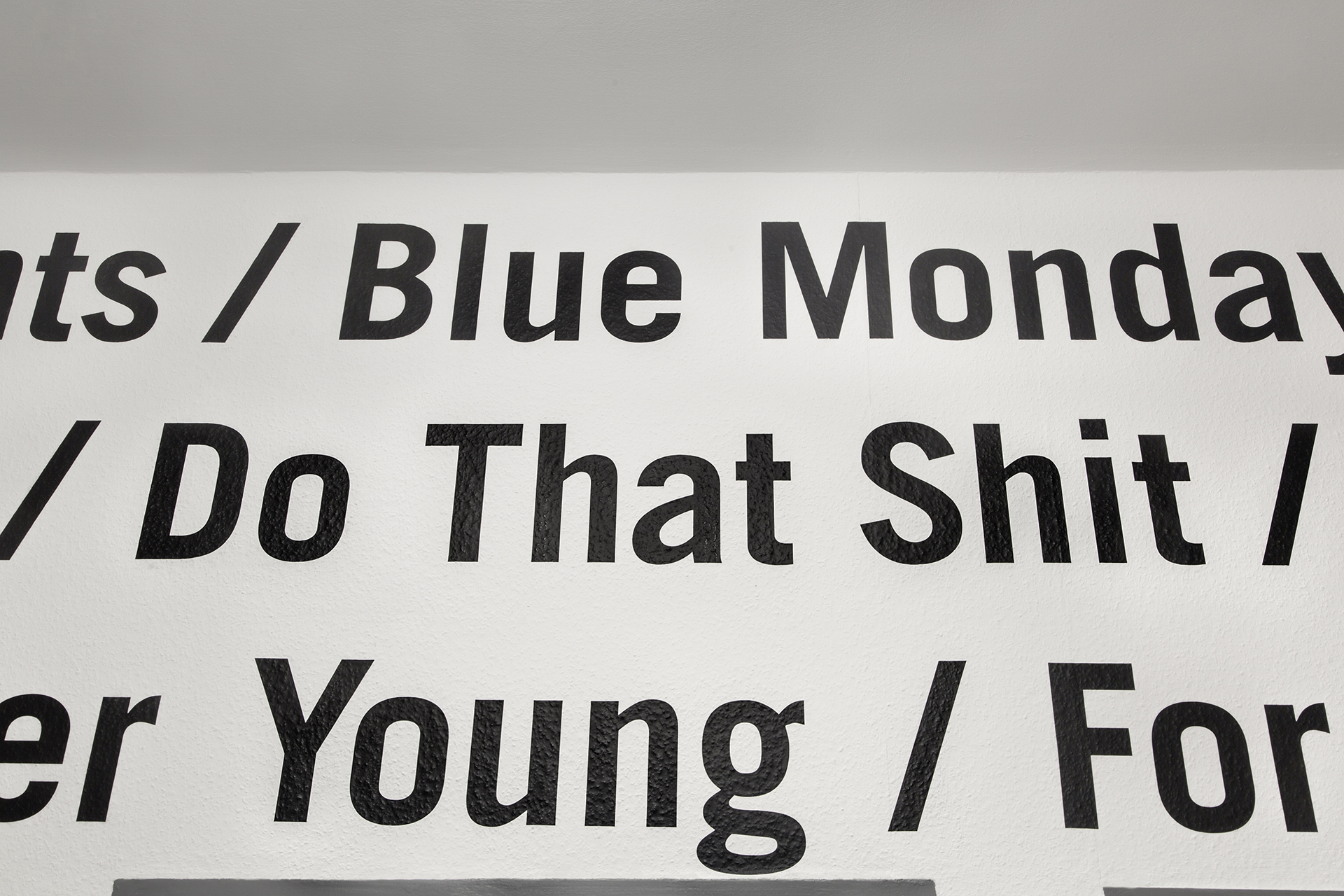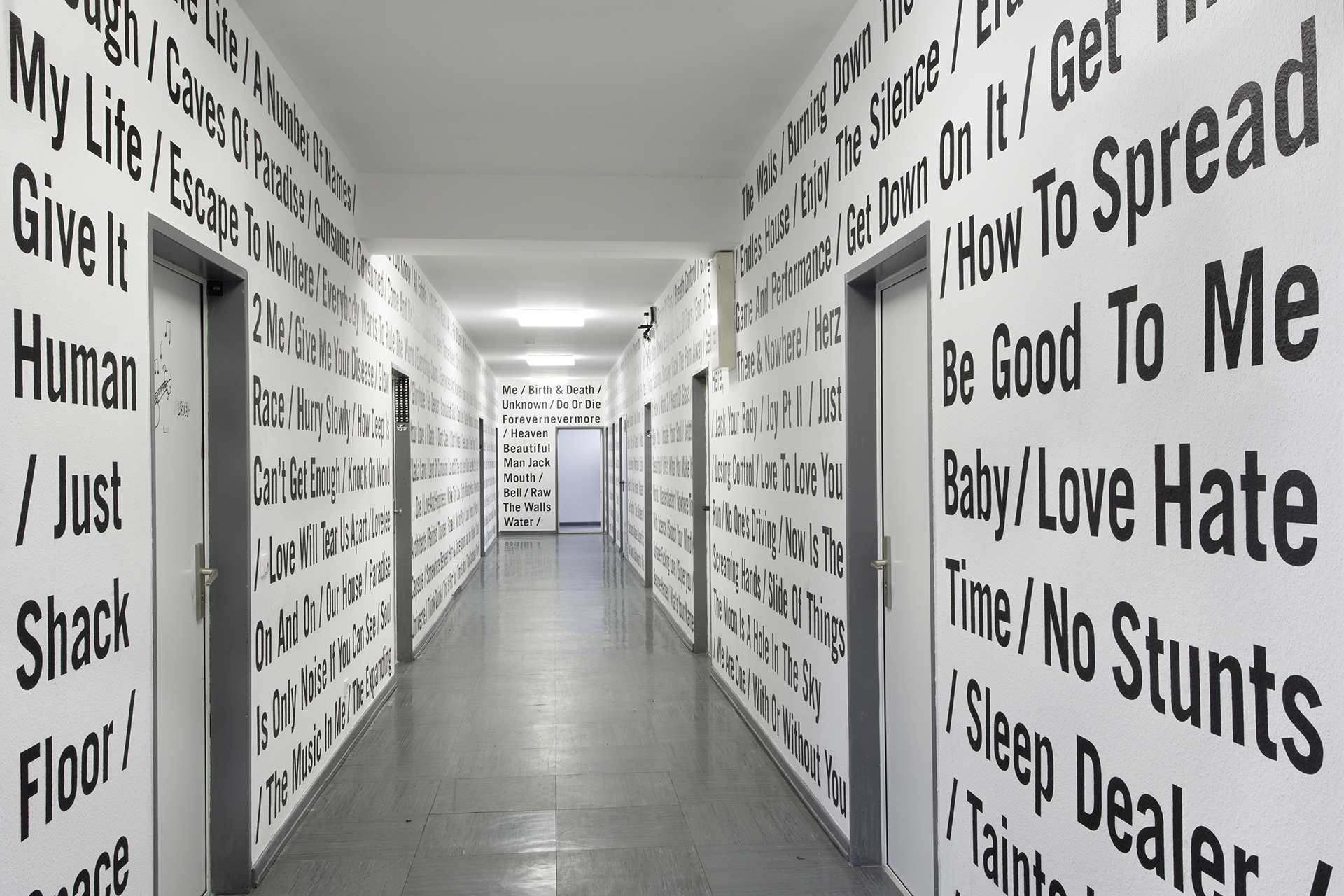 Typografische Wandgestaltung für das Offenbacher Institut für Klangforschung auf der Basis ausgewählter Tracks aus dem Bereich der elektronischen Musik. Vier ortsbezogene Wanduhren für das Tonstudio ergänzen die Installation.