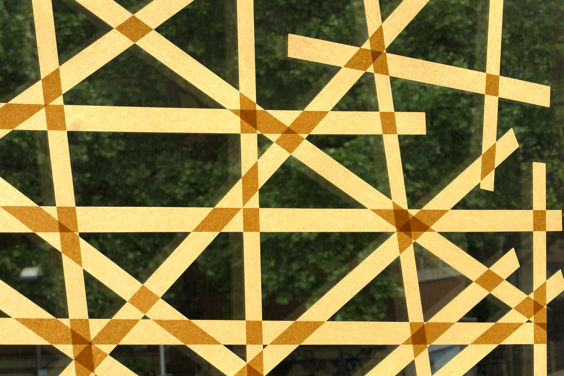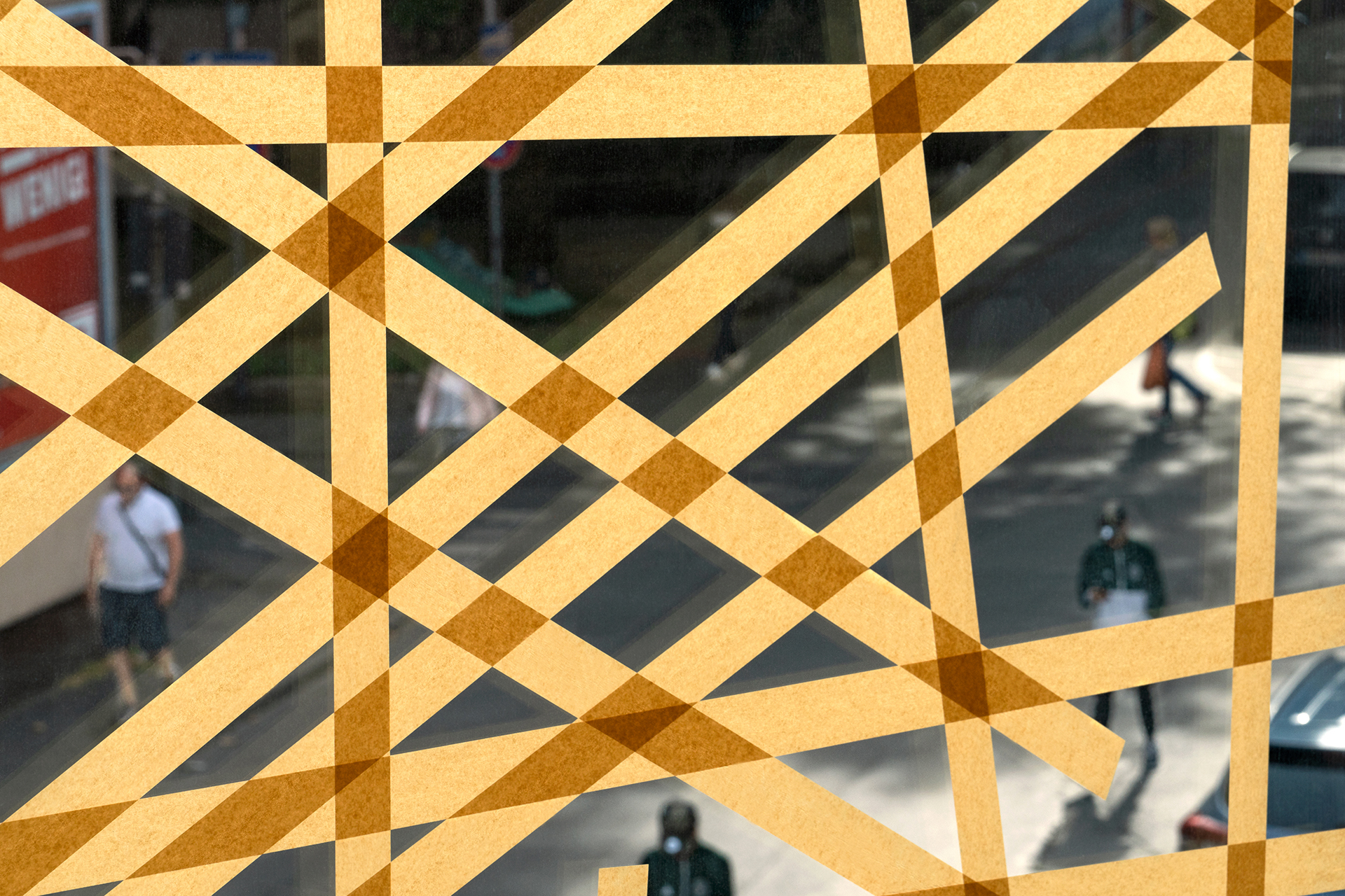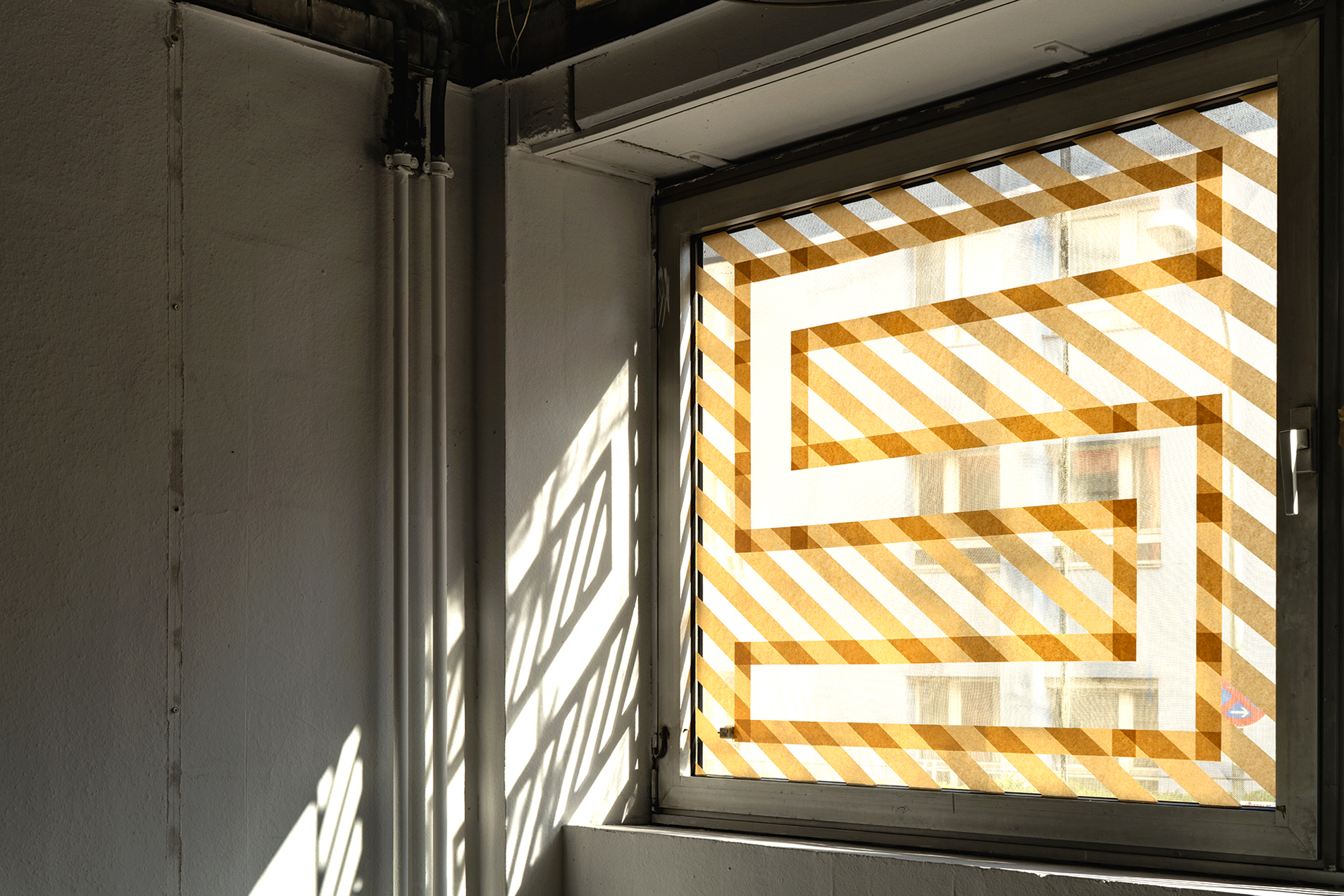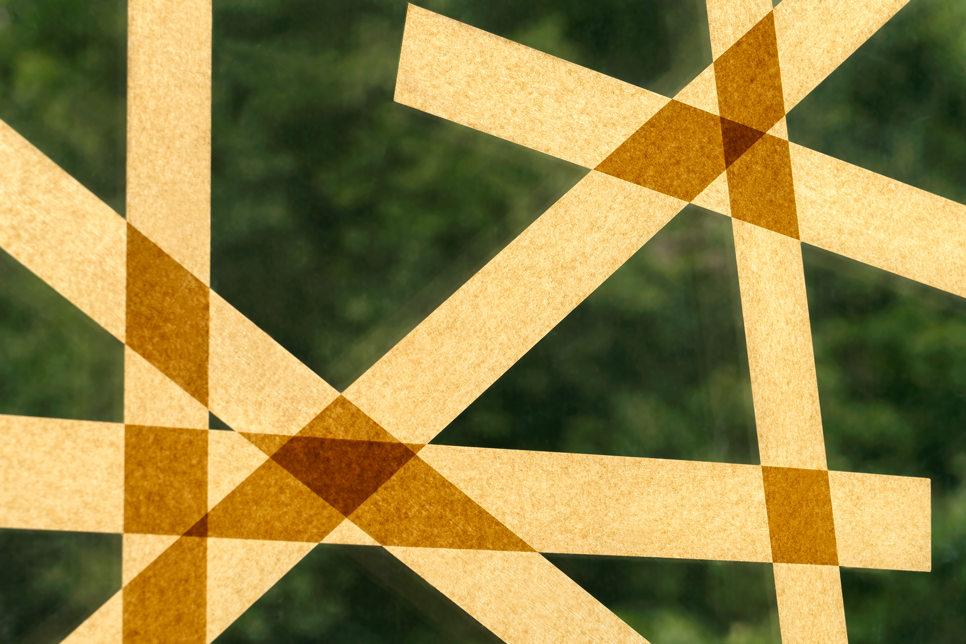 Um sich bei Bombenangriffen vor fliegenden Glassplittern zu schützen, bekleben Menschen seit langer Zeit ihre Fensterscheiben systematisch oder chaotisch mit Klebeband. In einer Mischung aus Schutz und Dekoration entstehen so, vor allem in Frankreich und England im zweiten Weltkrieg, geometrische Arrangements aus braunem Tape. Bis in unsere Zeit finden sich solche Beklebungen in Vorausahnung einer möglichen Katastrophe.