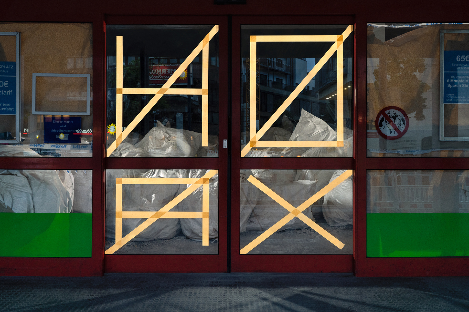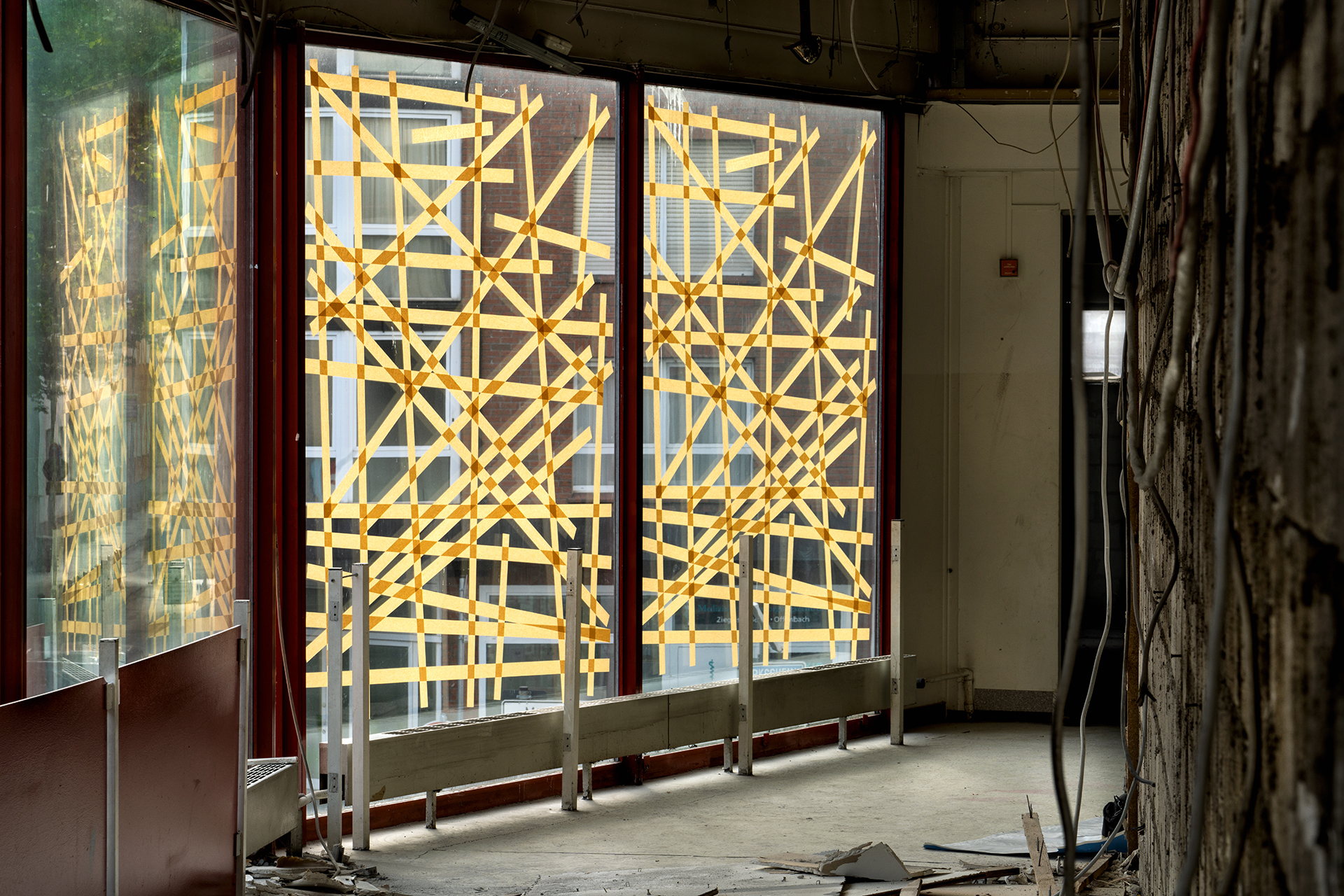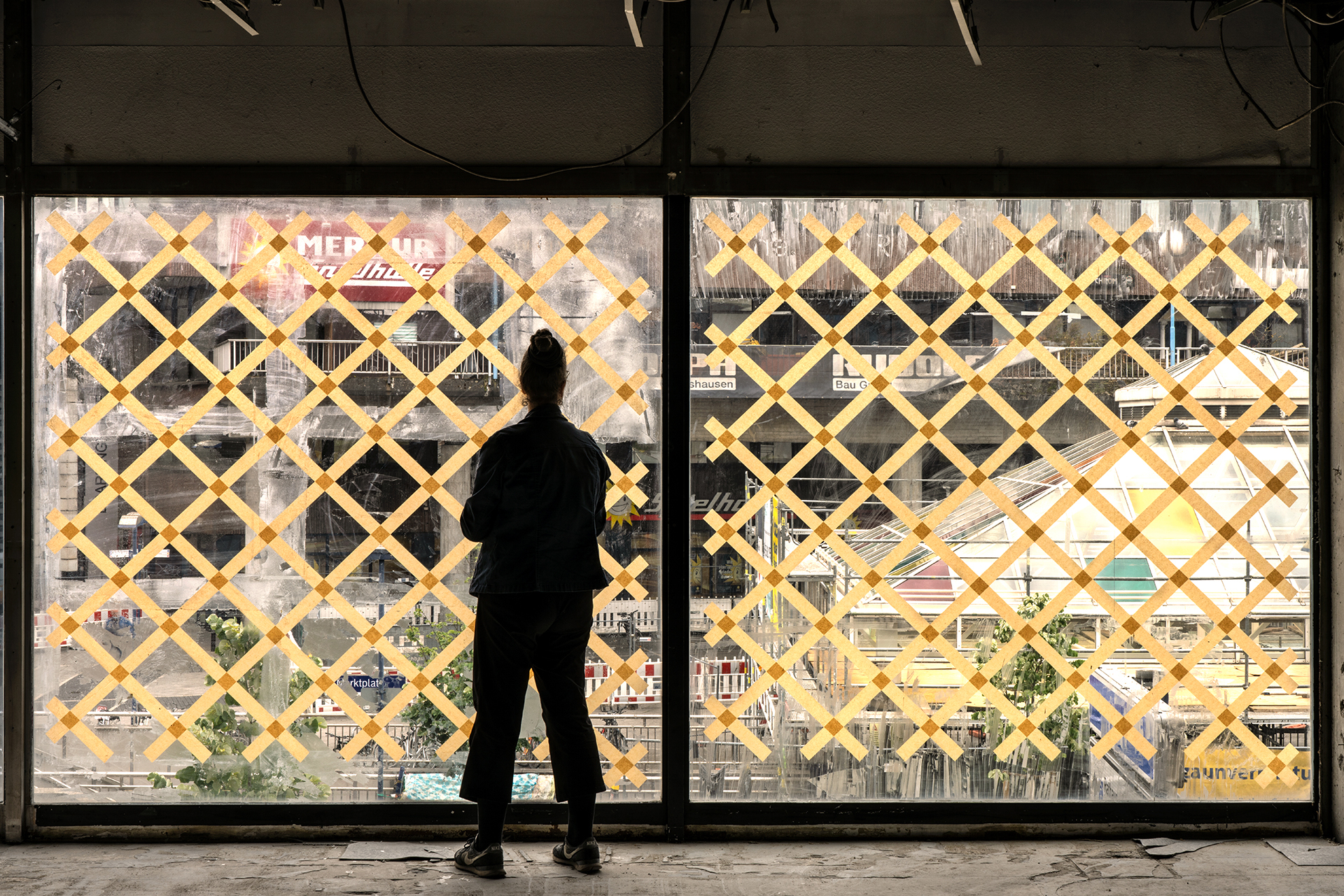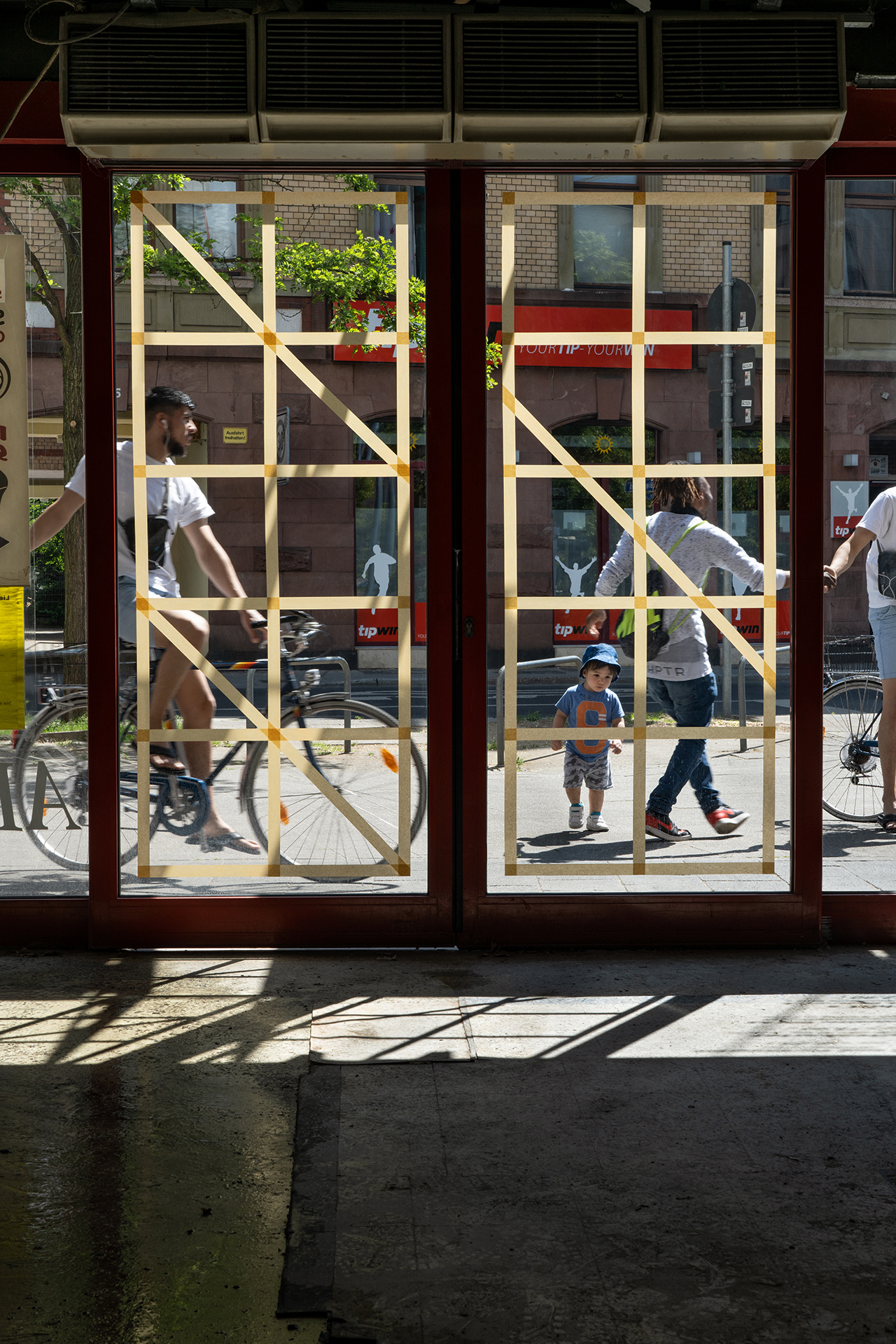 Um sich bei Bombenangriffen vor fliegenden Glassplittern zu schützen, bekleben Menschen seit langer Zeit ihre Fensterscheiben systematisch oder chaotisch mit Klebeband. In einer Mischung aus Schutz und Dekoration entstehen so, vor allem in Frankreich und England im zweiten Weltkrieg, geometrische Arrangements aus braunem Tape. Bis in unsere Zeit finden sich solche Beklebungen in Vorausahnung einer möglichen Katastrophe.
