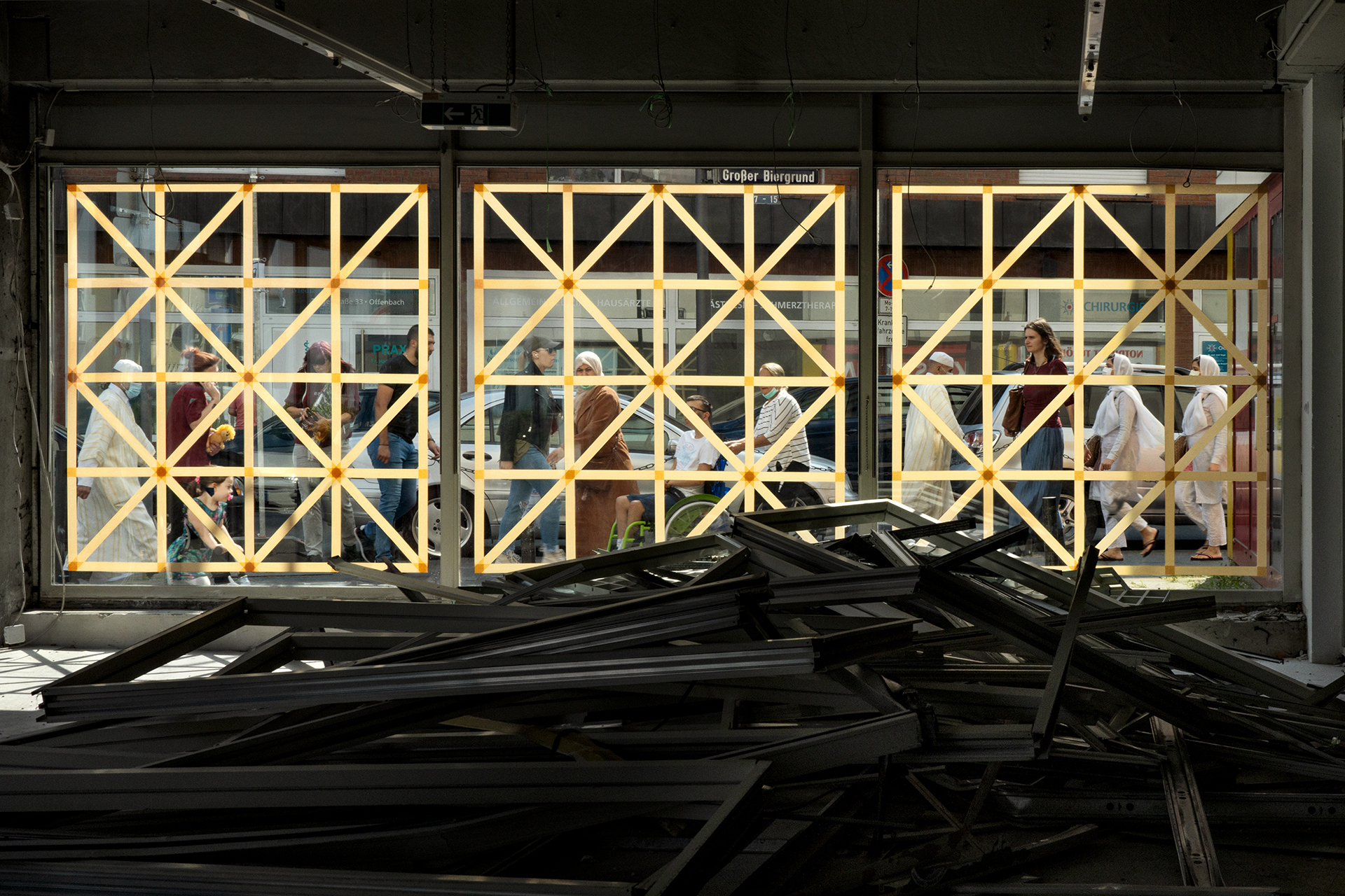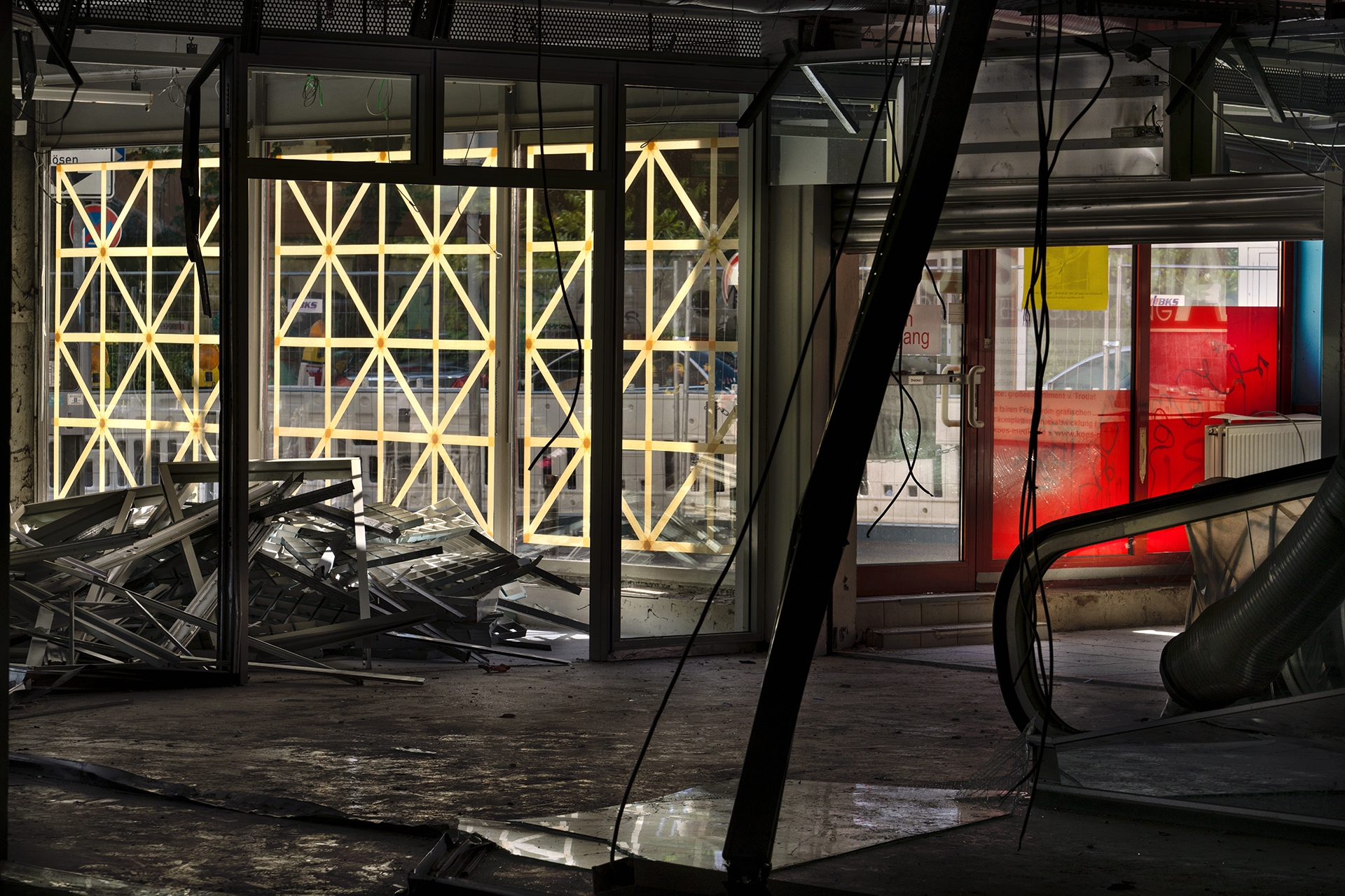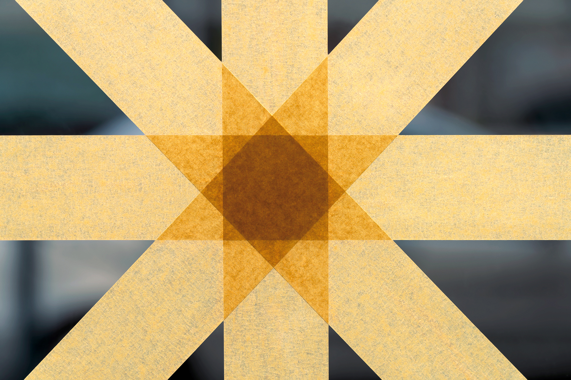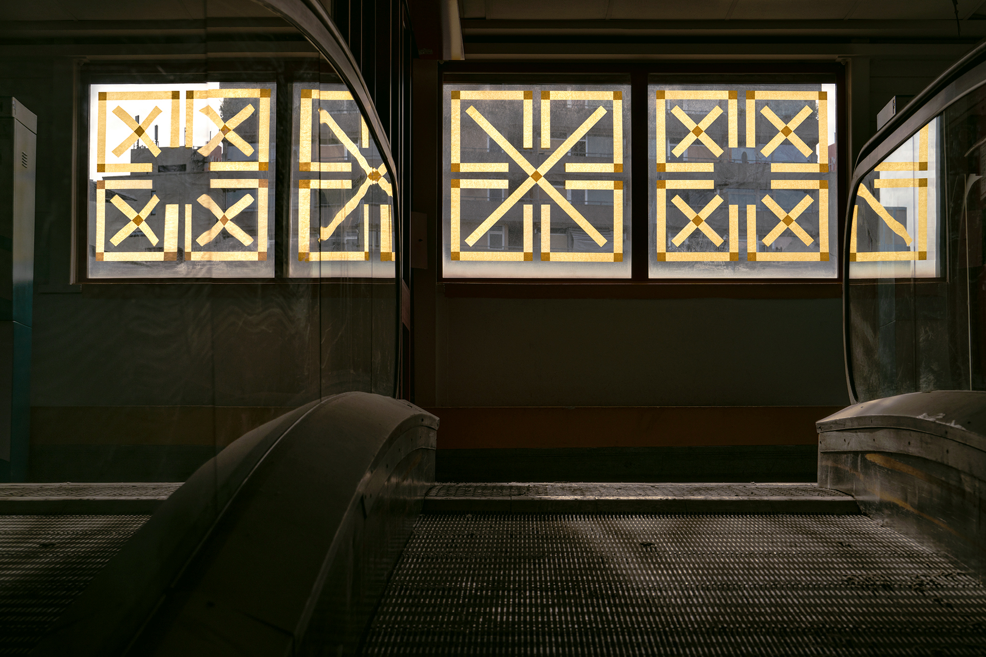 Um sich bei Bombenangriffen vor fliegenden Glassplittern zu schützen, bekleben Menschen seit langer Zeit ihre Fensterscheiben systematisch oder chaotisch mit Klebeband. In einer Mischung aus Schutz und Dekoration entstehen so, vor allem in Frankreich und England im zweiten Weltkrieg, geometrische Arrangements aus braunem Tape. Bis in unsere Zeit finden sich solche Beklebungen in Vorausahnung einer möglichen Katastrophe.
