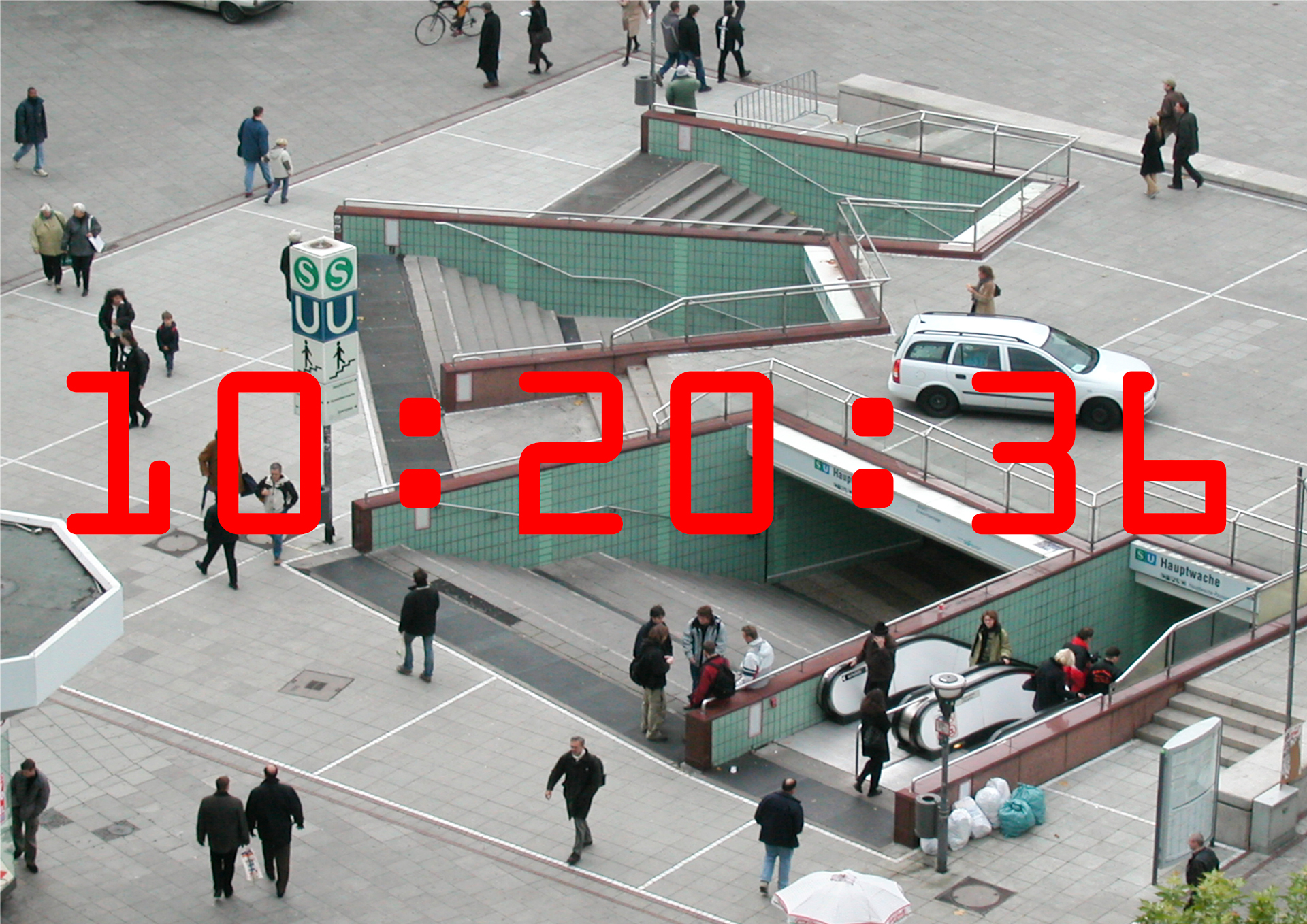Das Motiv des Andauerns und der Wiederholung findet sich auch in der Videoaufnahme. Die wiederkehrenden Muster der wenig variierenden Bewegungen von Passanten auf dem Platz vermitteln den Eindruck eines visuellen Gleichklangs. Die Distanz der Kamera vom Geschehen nivelliert Details und eine zeitliche Veränderung wird hauptsächlich durch die wechselnde Lichtsituation von Nacht über Tag zu Nacht deutlich.