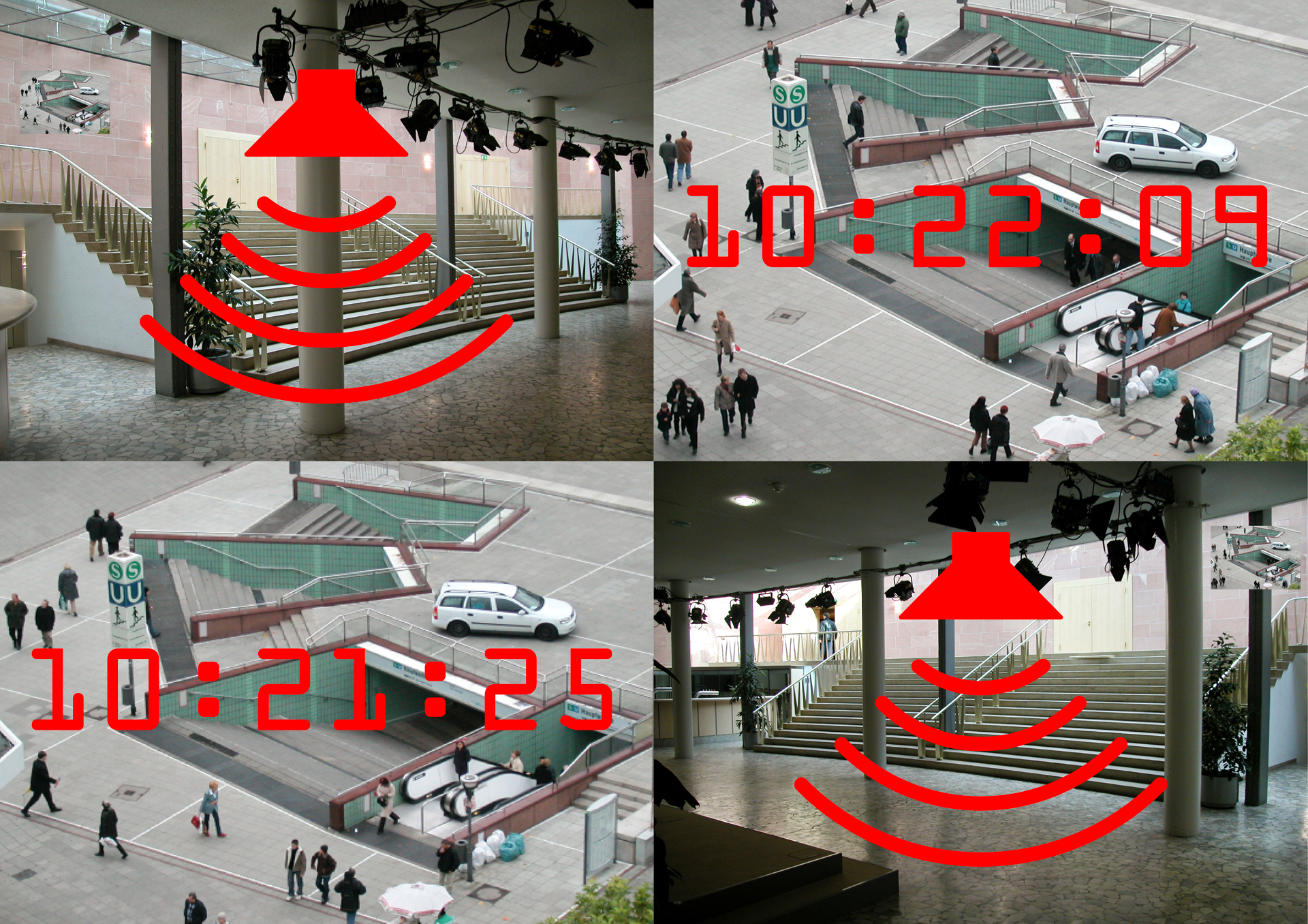 Den statischen, überwachenden Blick der Kamera und ihrer Bilder von Oben kombiniert Blum mit zeitgleich entstandenen, subjektiven Tonaufnahmen aus dem direkt darunter liegenden Bereich der Hauptwache. Indem sie ein Mikrophon durch die Zonen der B-Ebene bewegten, stellten der Künstler und ein Assistent dort eine 24-stündige Klangaufnahme her.