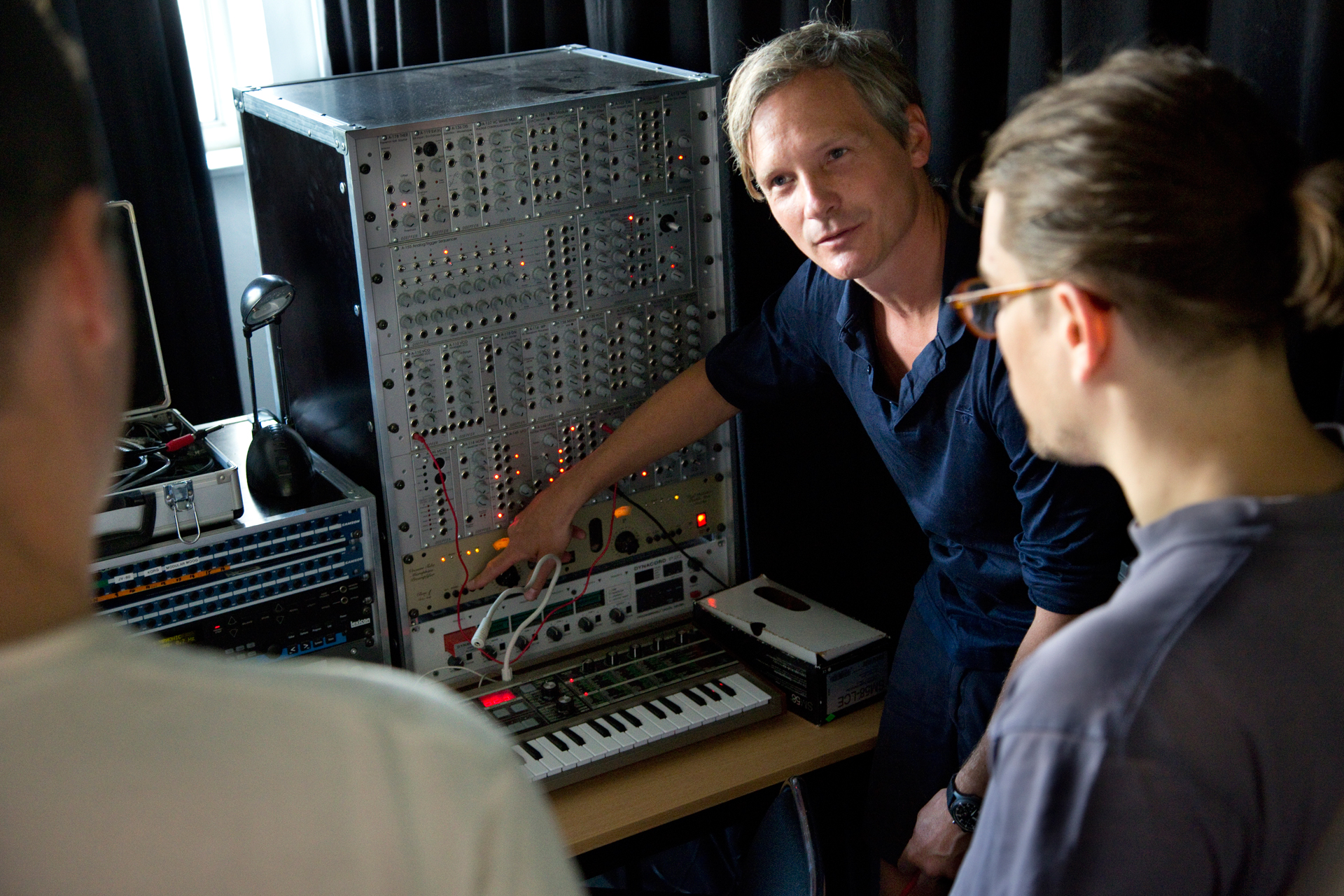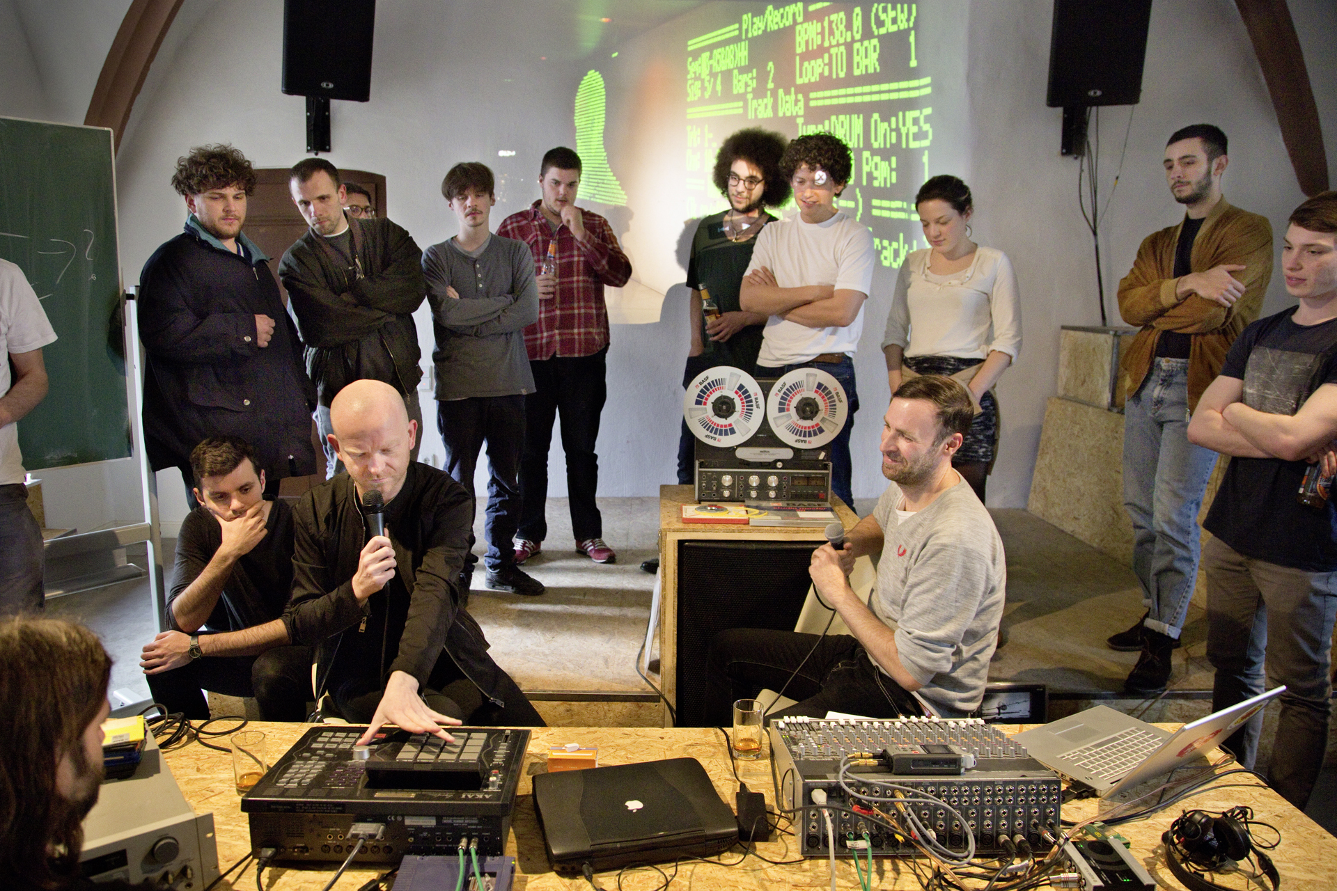 Die Bilder zeigen IfK-Workshops mit Atom TM, Hans Nieswandt, Analog Roland Orchestra und Honji Wang in den Schloßkapellen der HfG Offenbach, eine Exkursion zum Studio für Elektronische Musik des WDR in Köln, sowie Workshops im Soundlab der Frankfurter Städelschule mit den Dozenten Chris Beisswenger, Lupo Lubich und Daniel Fort.