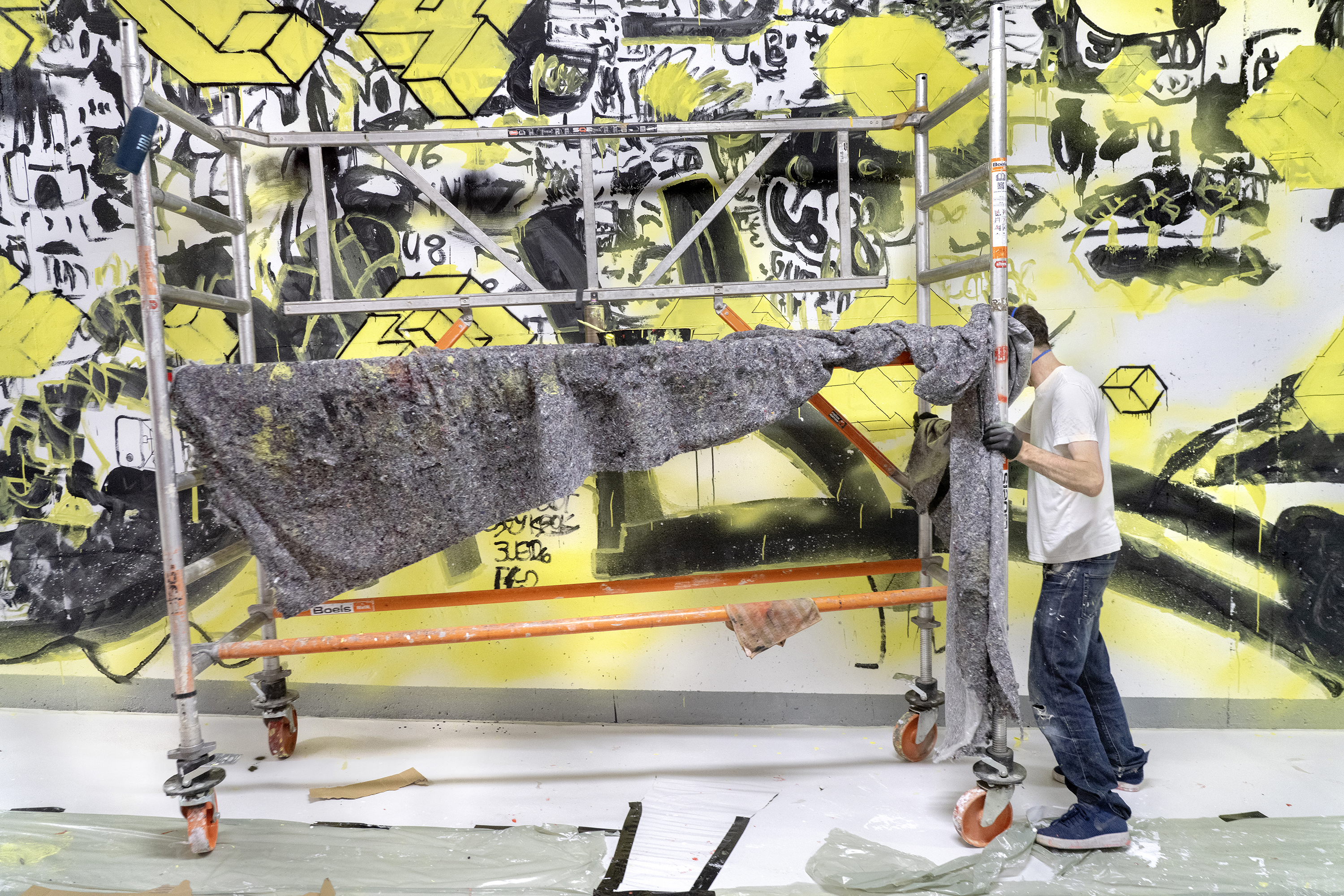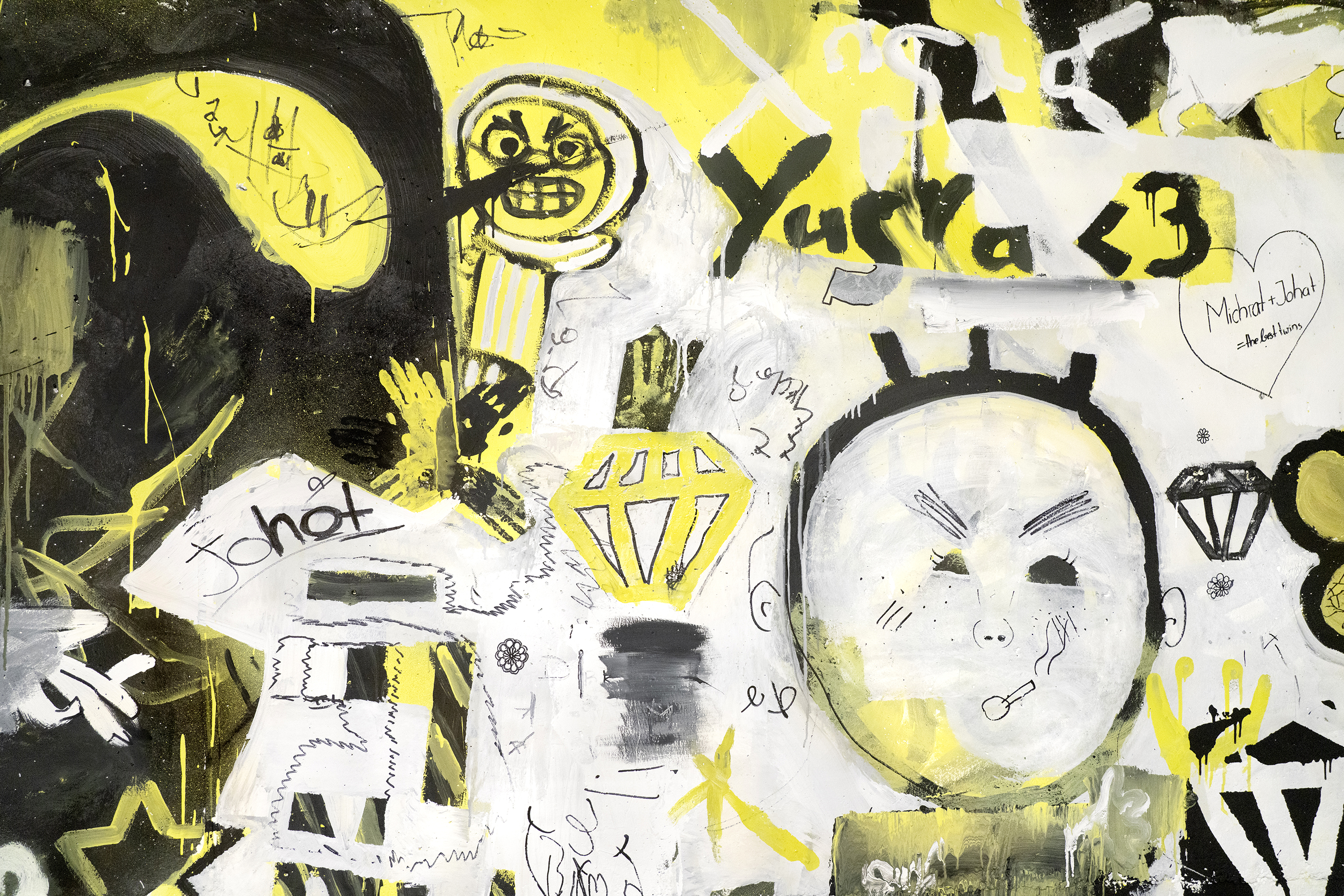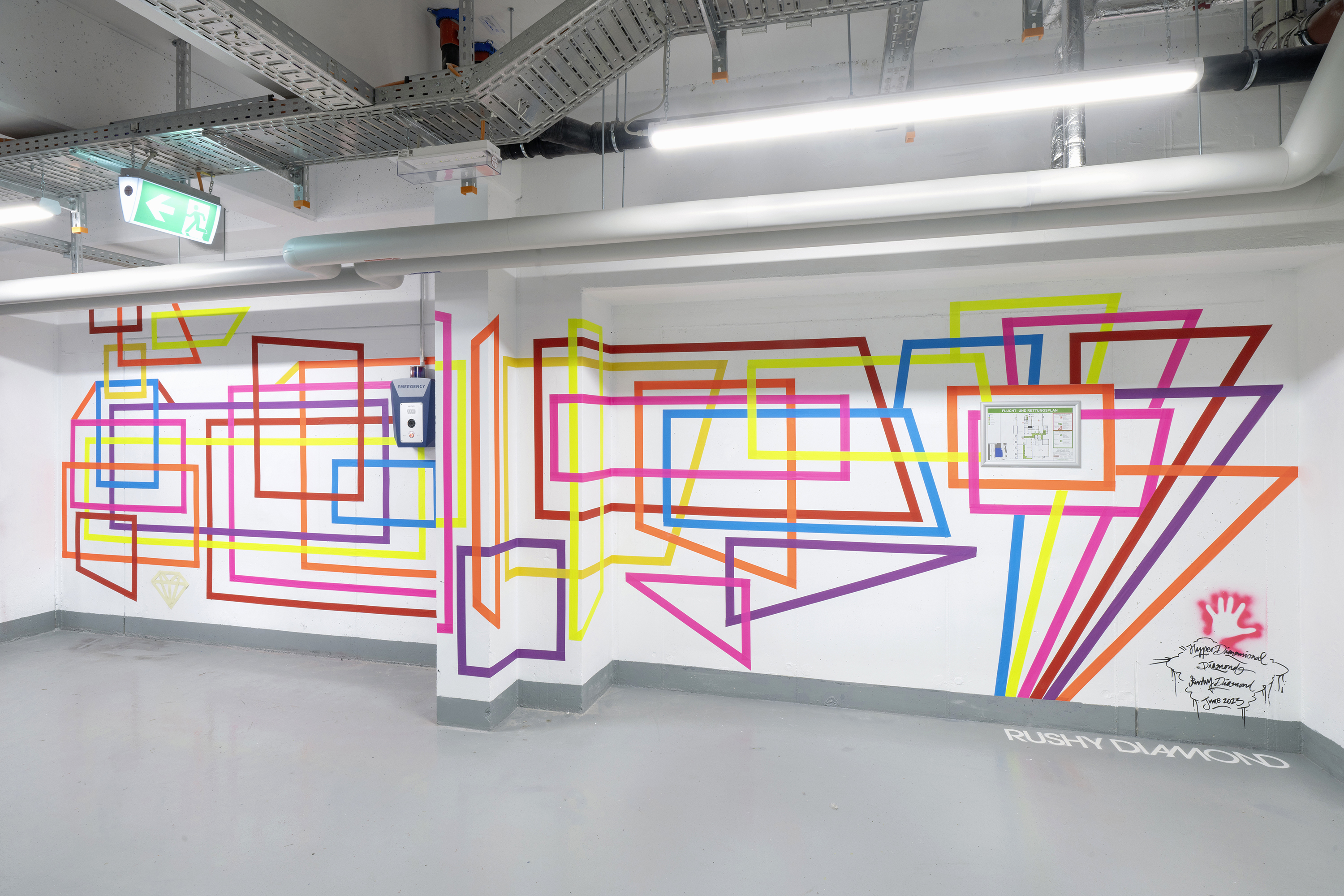 Sowohl die Diamonds wie auch Collettivo FX arbeiteten für ihre Wandgestaltung mit Schüler_innen der Diamantenschule zusammen, einer Kooperation des Diamant mit dem Offenbacher Rudolf Koch Gymnasium. Noch bevor die Künstler_innen zur Gestaltung ihrer Wände eintrafen, bemalten die Diamonds mit den Schüler_innen alle Wände der Liegenschaft in gelb und schwarz, so dass niemand mit einer weissen Wand beginnen konnte. Viele integrierten die gelb-schwarze »Grundierung« in ihre Arbeiteb.