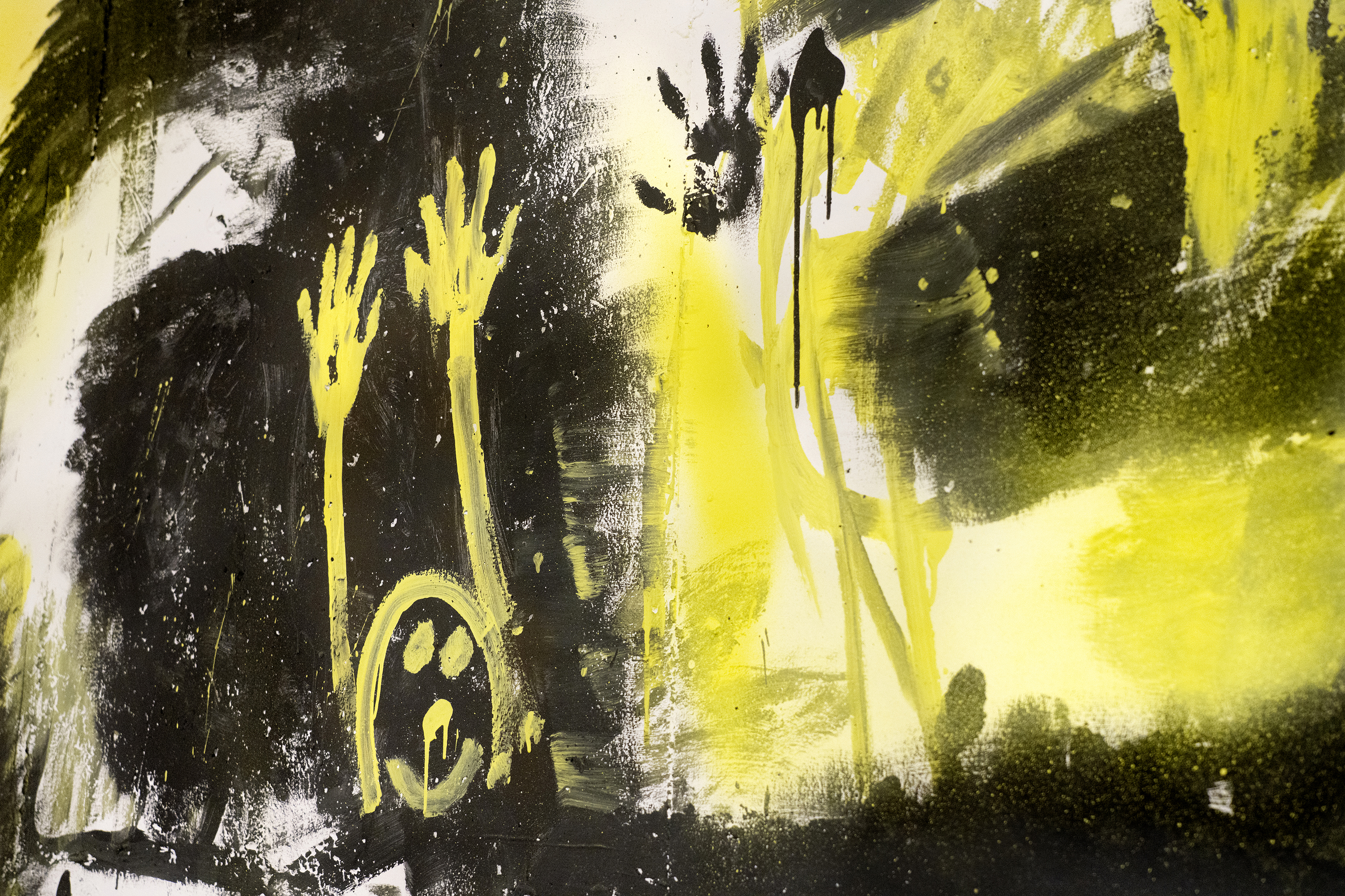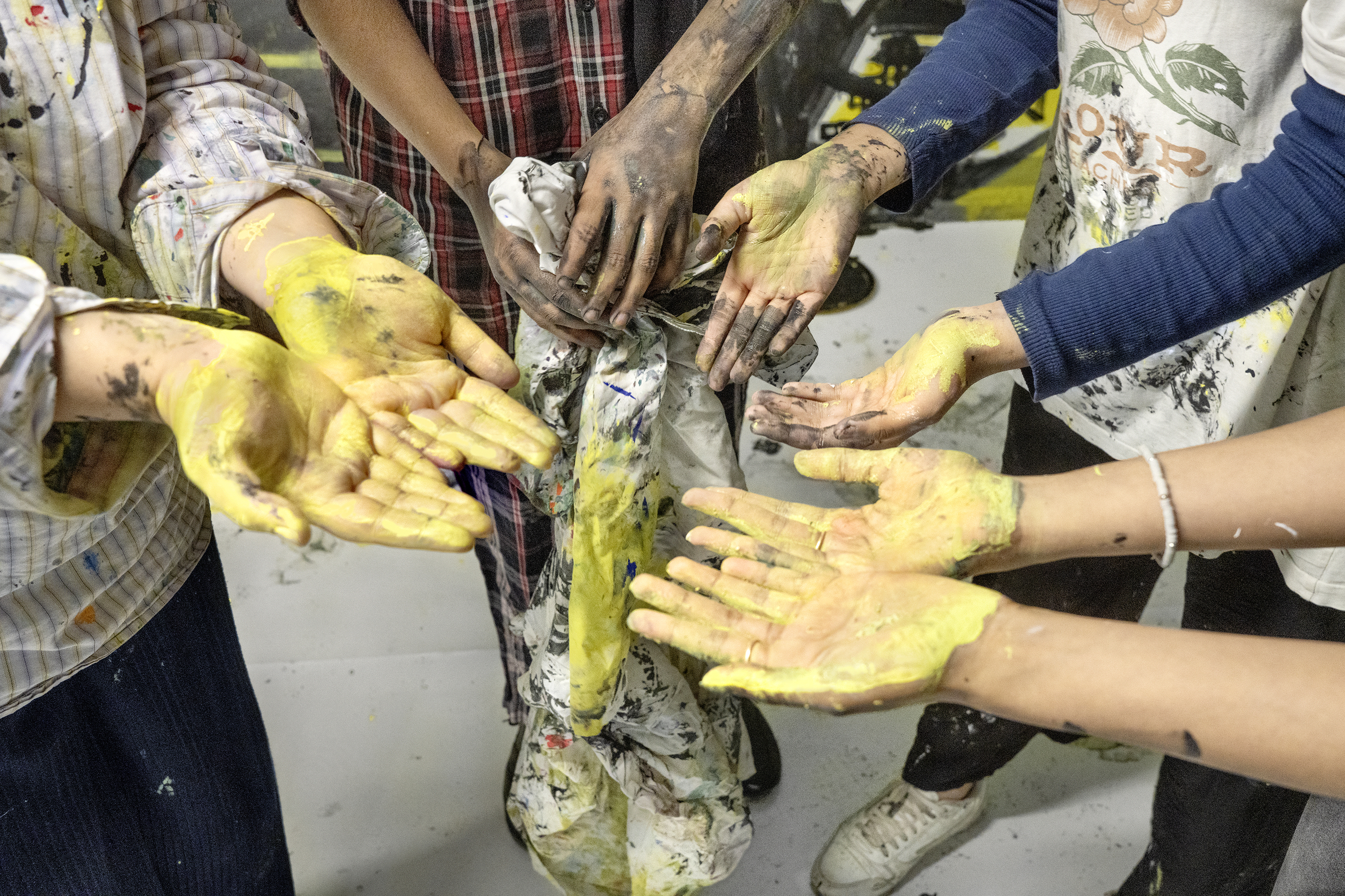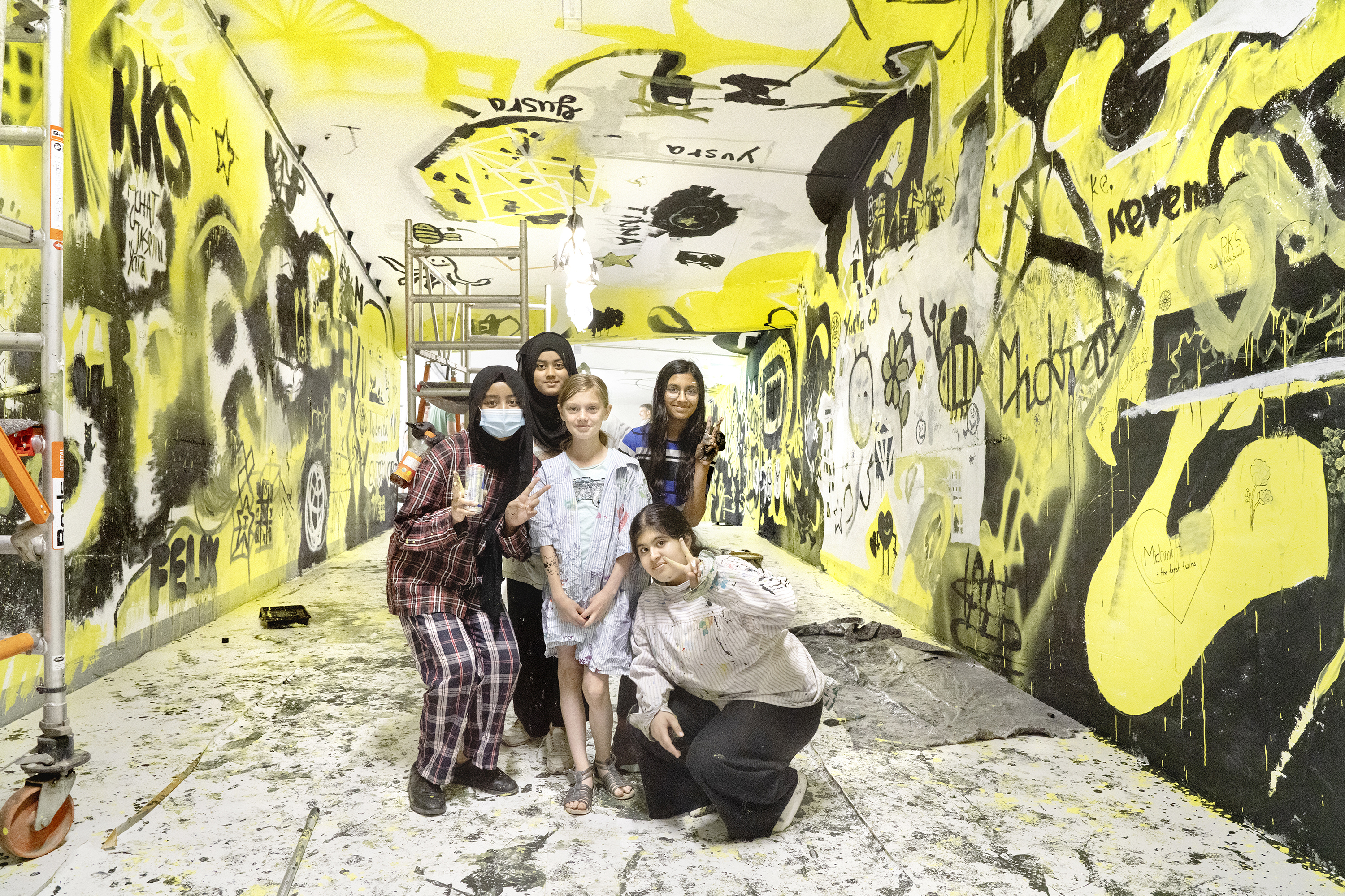 Sowohl die Diamonds wie auch Collettivo FX arbeiteten für ihre Wandgestaltung mit Schüler_innen der Diamantenschule zusammen, einer Kooperation des Diamant mit dem Offenbacher Rudolf Koch Gymnasium. Noch bevor die Künstler_innen zur Gestaltung ihrer Wände eintrafen, bemalten die Diamonds mit den Schüler_innen alle Wände der Liegenschaft in gelb und schwarz, so dass niemand mit einer weissen Wand beginnen konnte. Viele integrierten die gelb-schwarze »Grundierung« in ihre Arbeiteb.