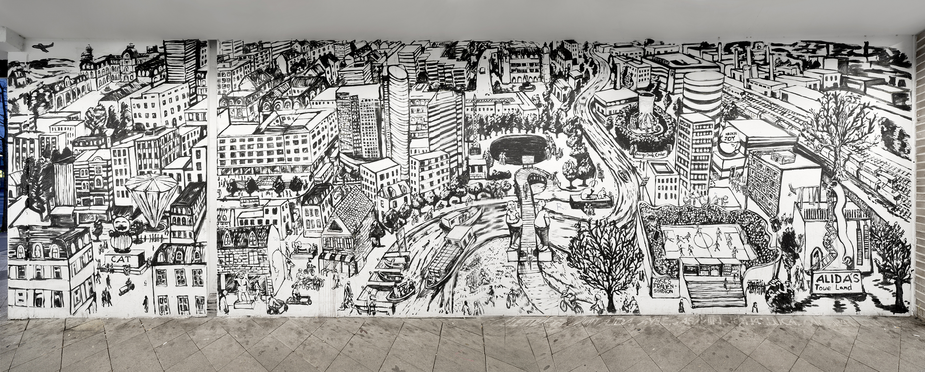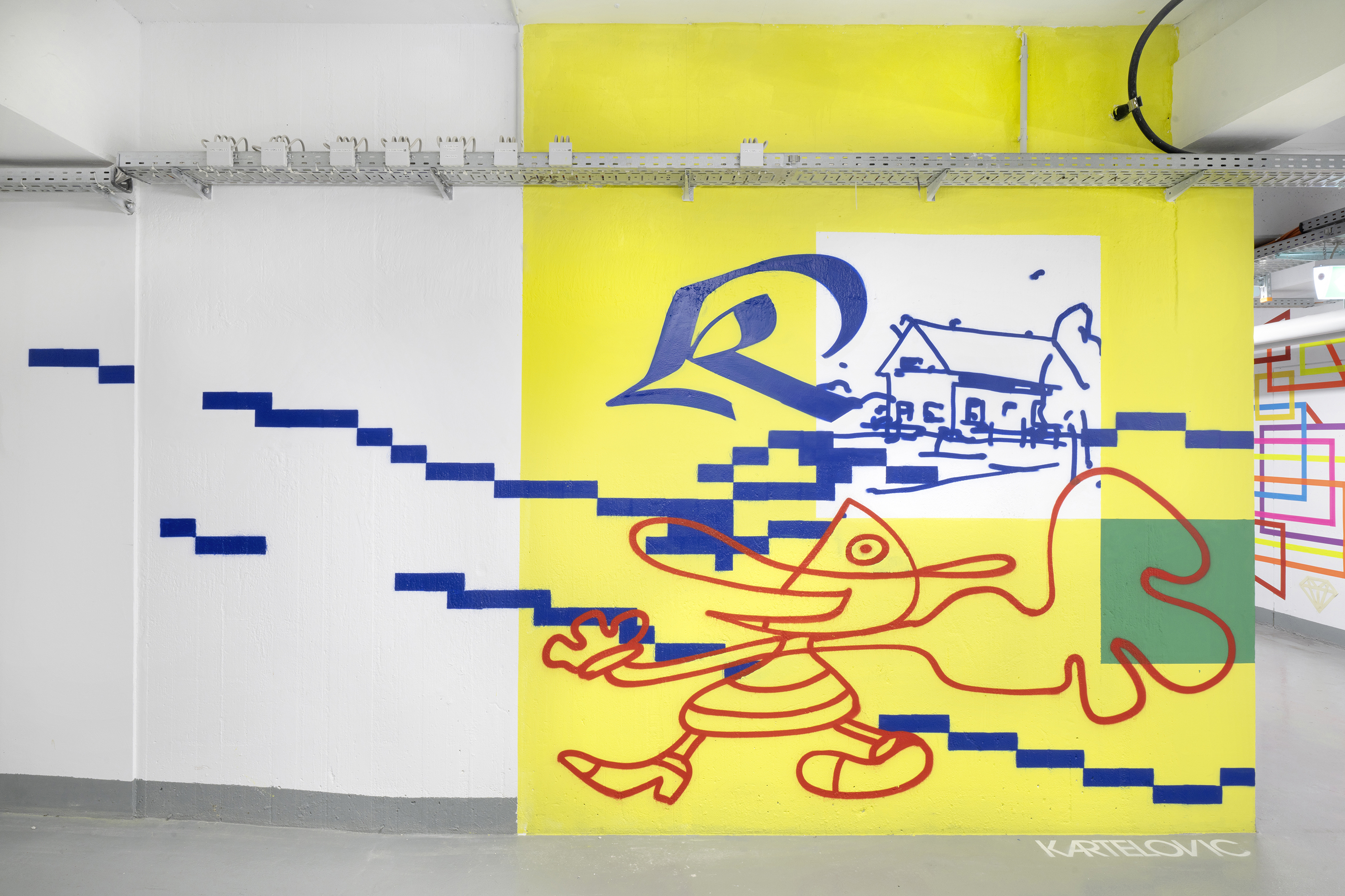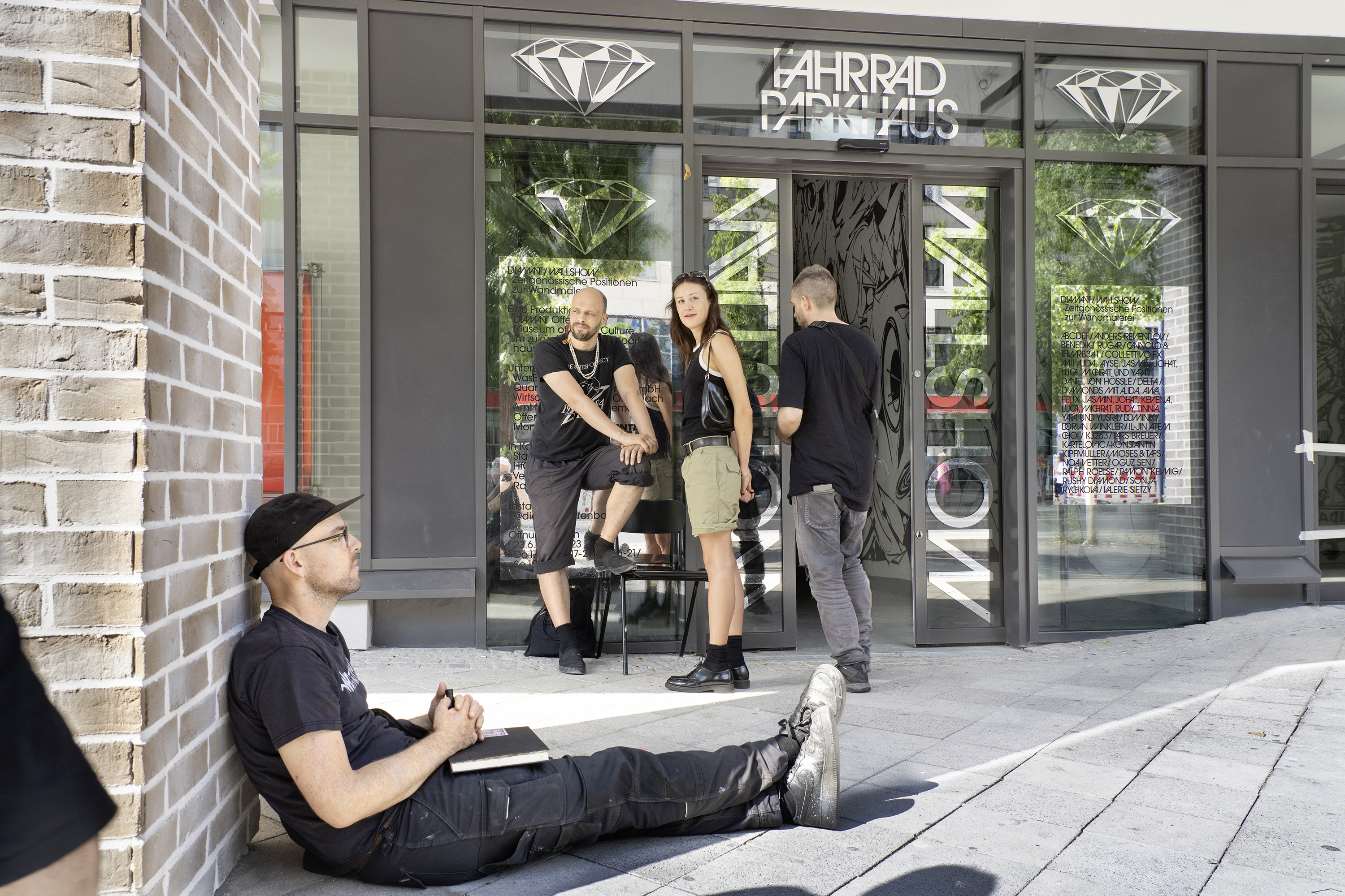 Beim Einfahren in die Fahrradgarage kann man die Wandkunst dynamisch und multiperspektivisch wahrnehmen, wie sonst nur aus dem Fenster der S-Bahn. In den Winkeln und Fluchten der städtischen Gebrauchsarchitektur ist urbane Kunst seit jeher zuhause. Der halb-öffentliche Raum des Fahrradparkhauses als Schnittstelle und Durchgangsort bietet ein ideales Umfeld für eine solche Art von Präsentation, bei der verschiedene Kunst- und Lebenswelten aufeinandertreffen.