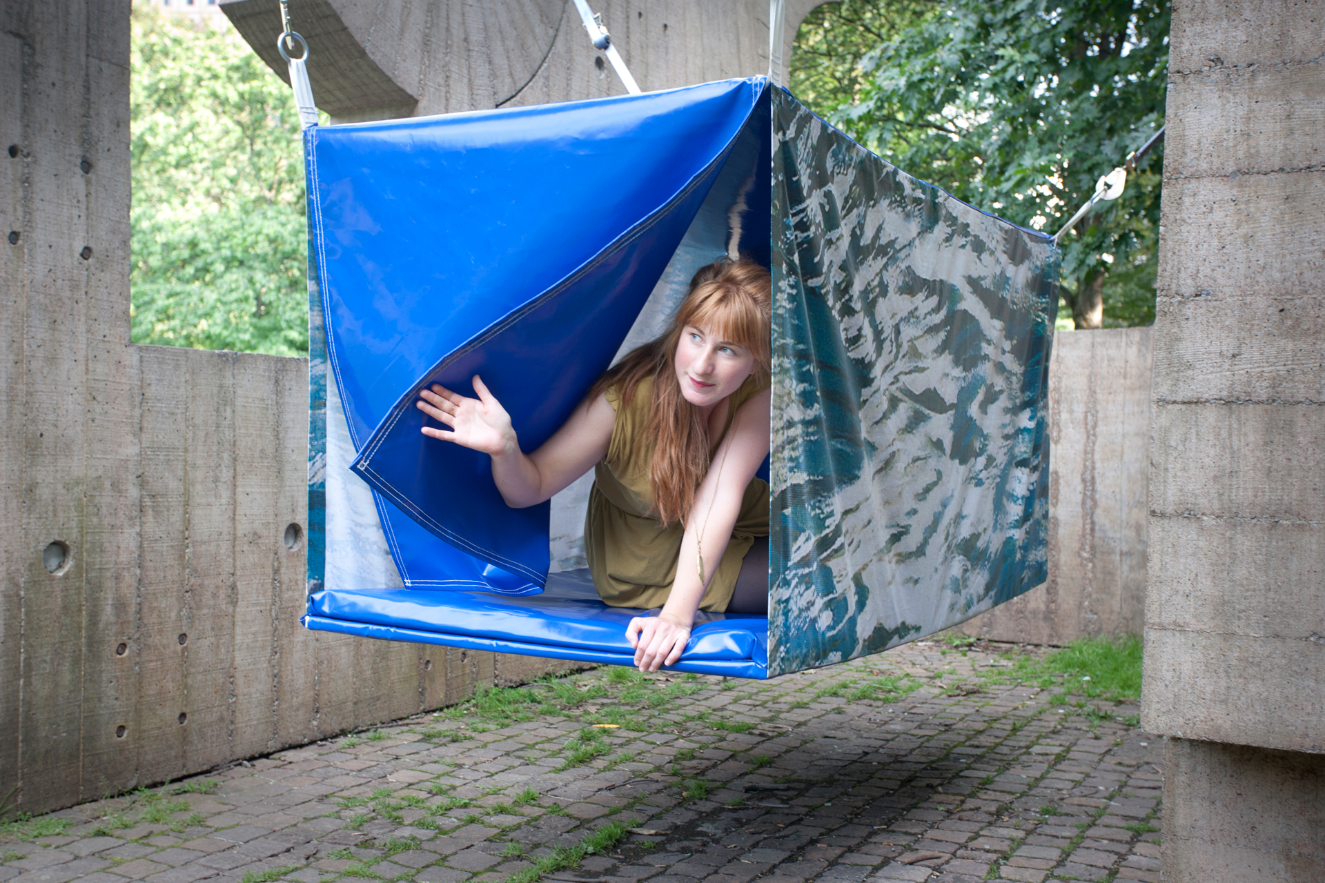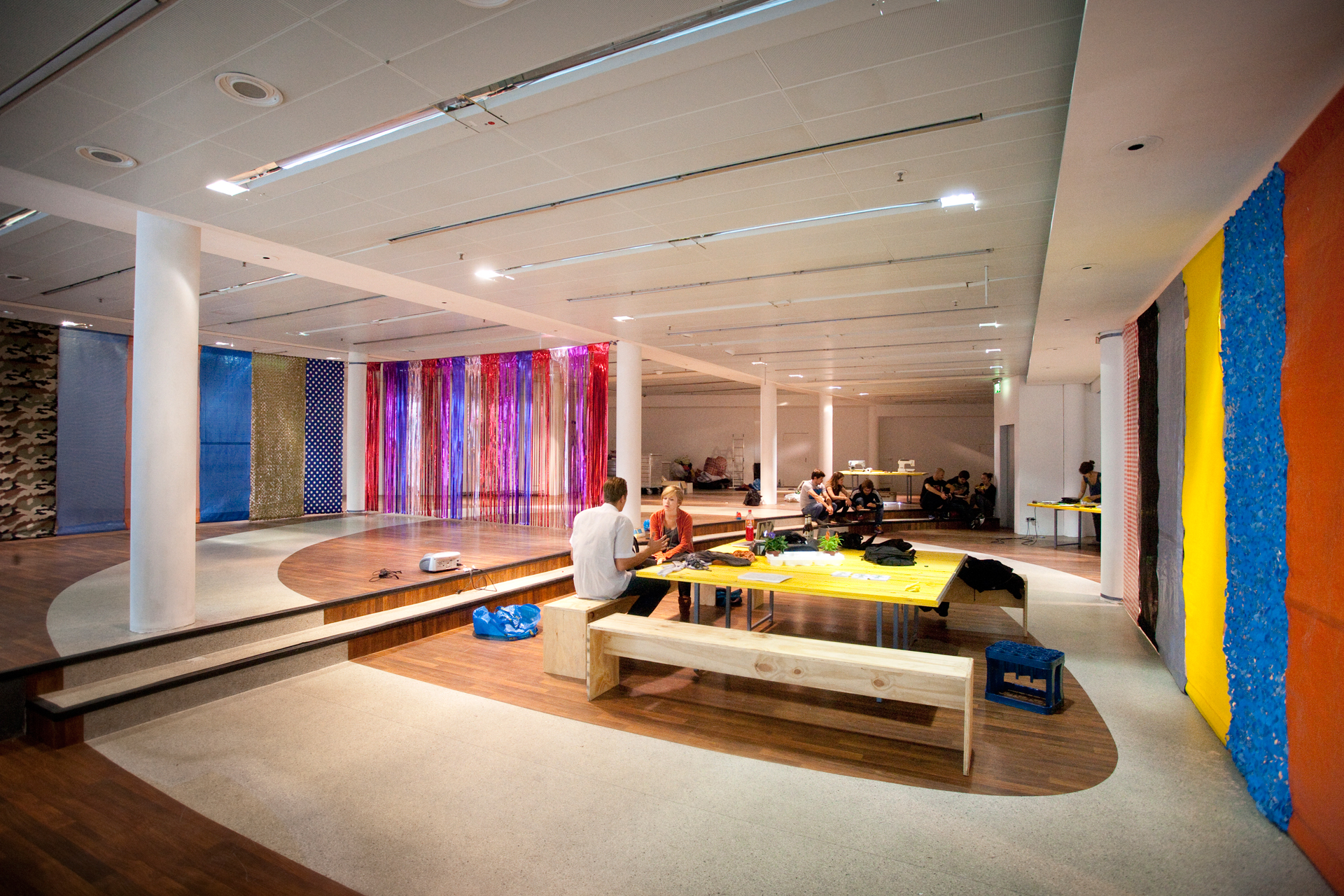 xqm startete mit der Strategie, zwischen Gevierten von Säulen, in Durchgängen, in öffentlichen Kunstwerken oder zwischen Bäumen Räume abzustecken und diese nach Bedarf der jeweiligen Projekte nach einem einfachen Prinzip mit Planen abzuspannen. So wurden »Architekturen« geschaffen, die dem minimalen Bedarf an räumlicher Abgrenzung entsprachen und für die Projekte eine »Bühne« schufen.