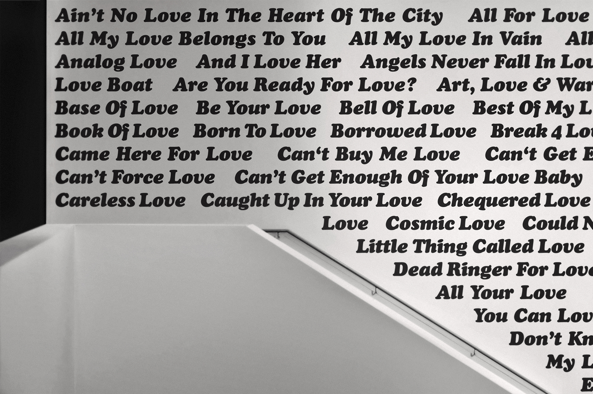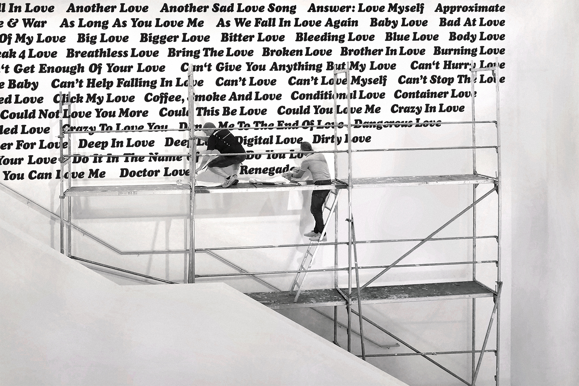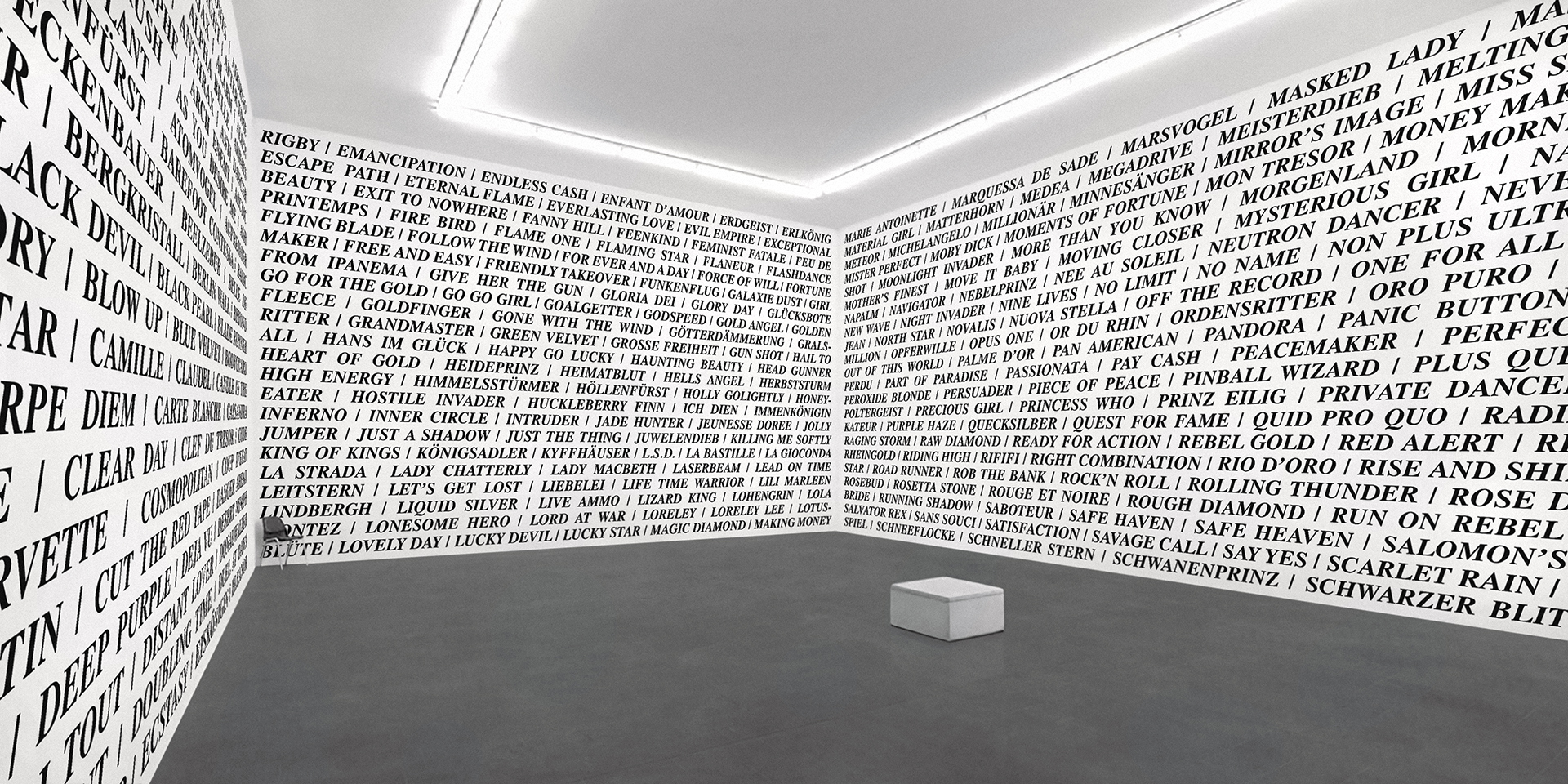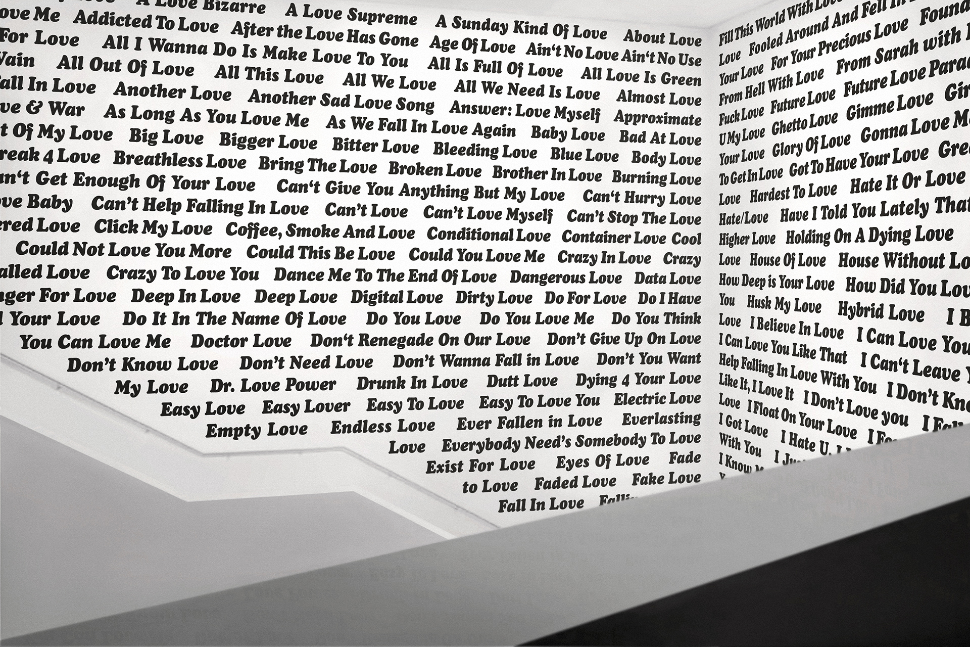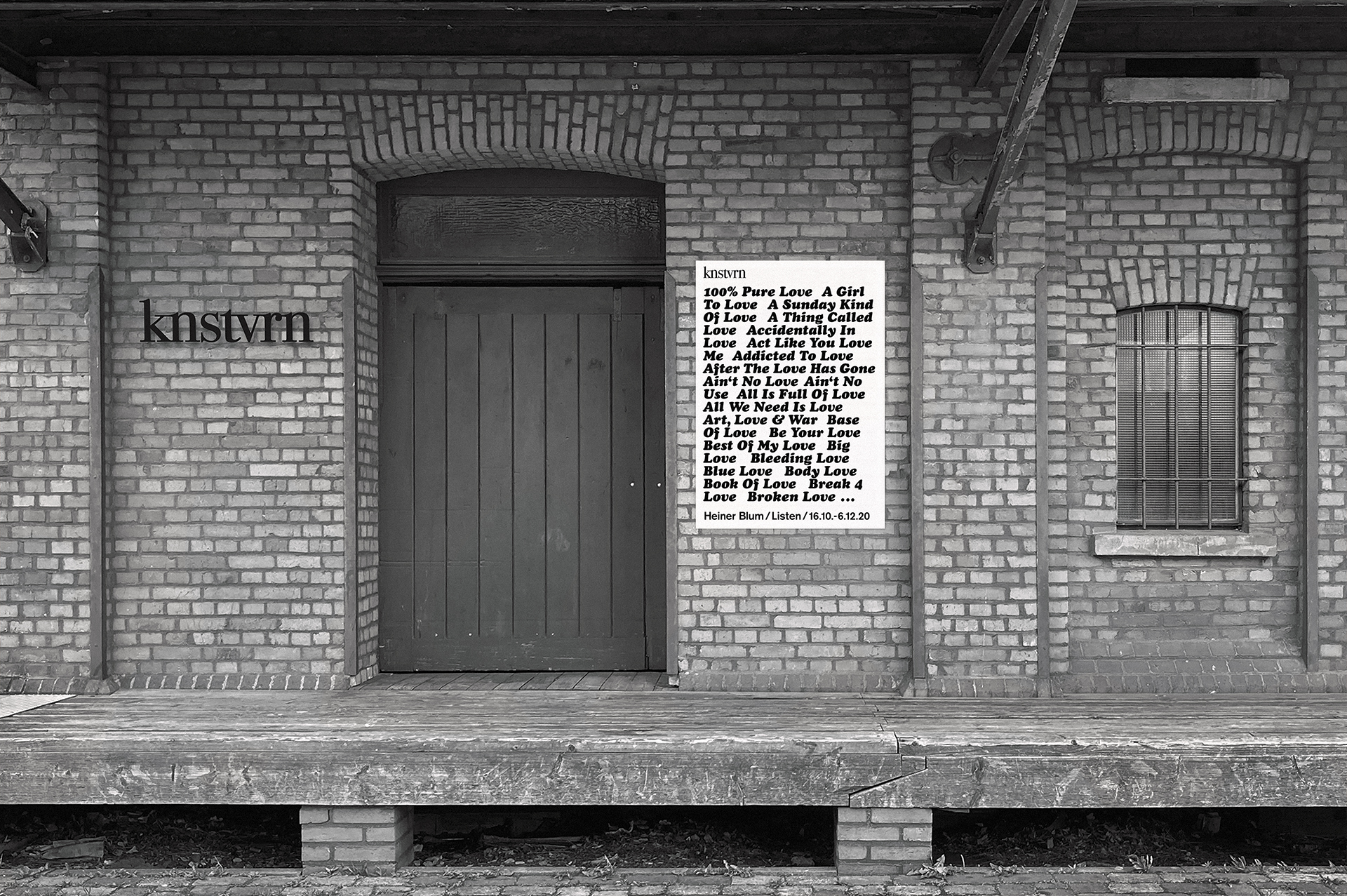 2020 realisiert Heiner Blum im KNSTVRN Bad Wonder in einer umfangreichen, aufwändigen Ausstellung gleich sechs raumumfassende Textinstallationen auf der Basis von Listen: »Love Songs«, »Nebenwirkungen«, »Thoroughbreds«, »The Thes«, »Pornstars« und das »Nuclear Weapon Archive«. Die »Love Songs« finden sich nicht nur im Treppenhaus des Kunstvereins sondern auch in einer Auswahl an der Außenhaut des Kunstmuseums Bad Wonder.