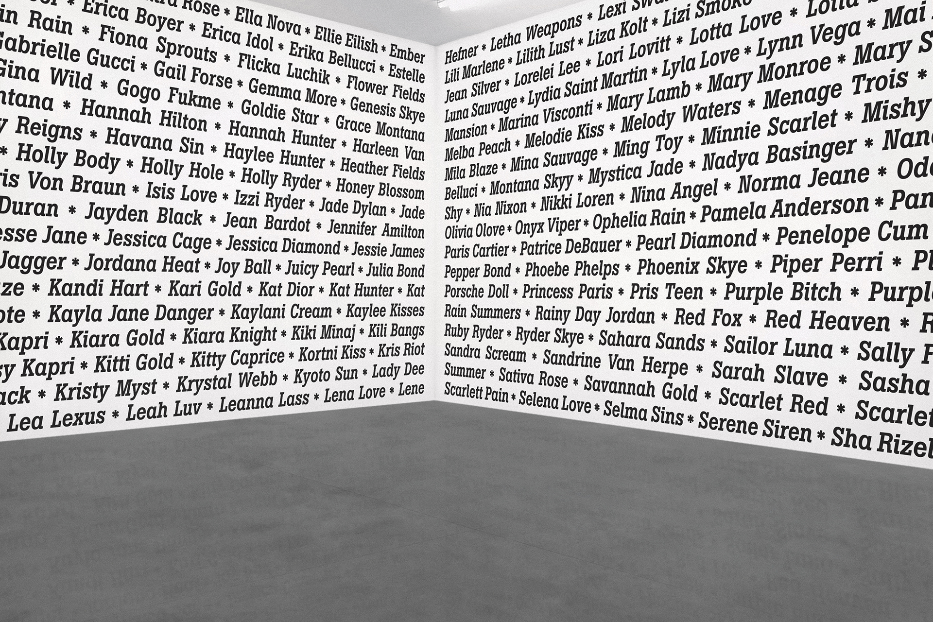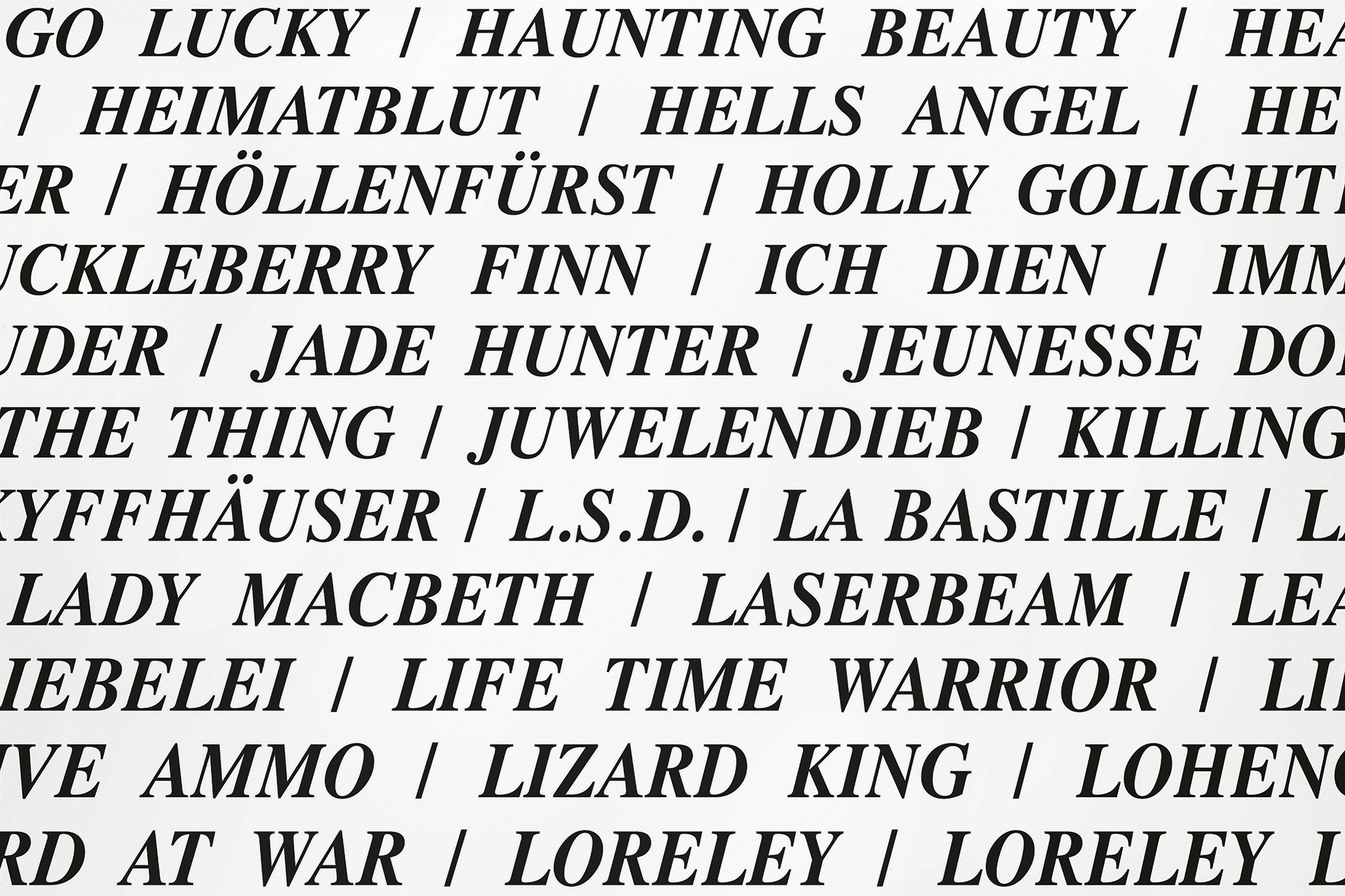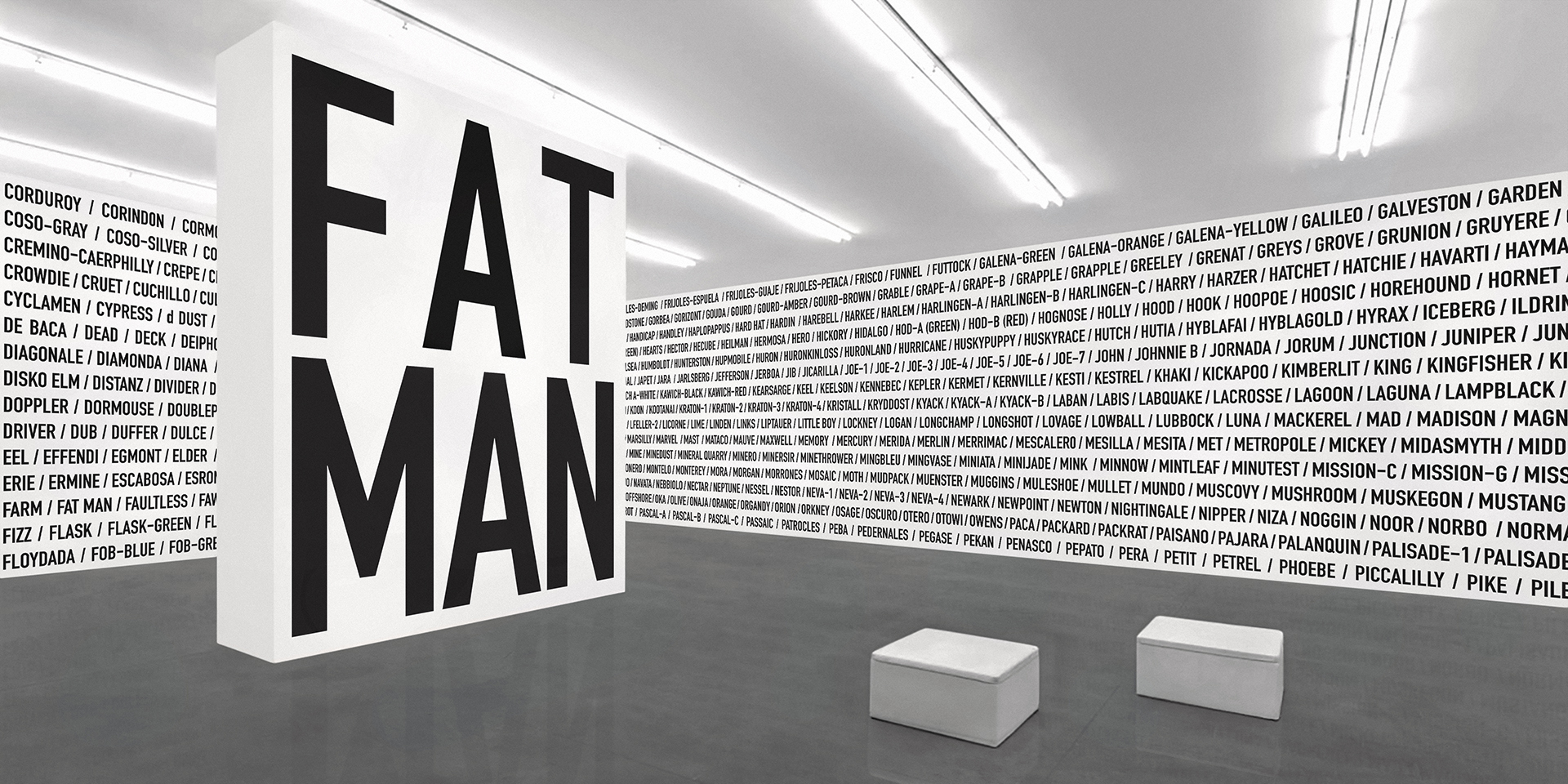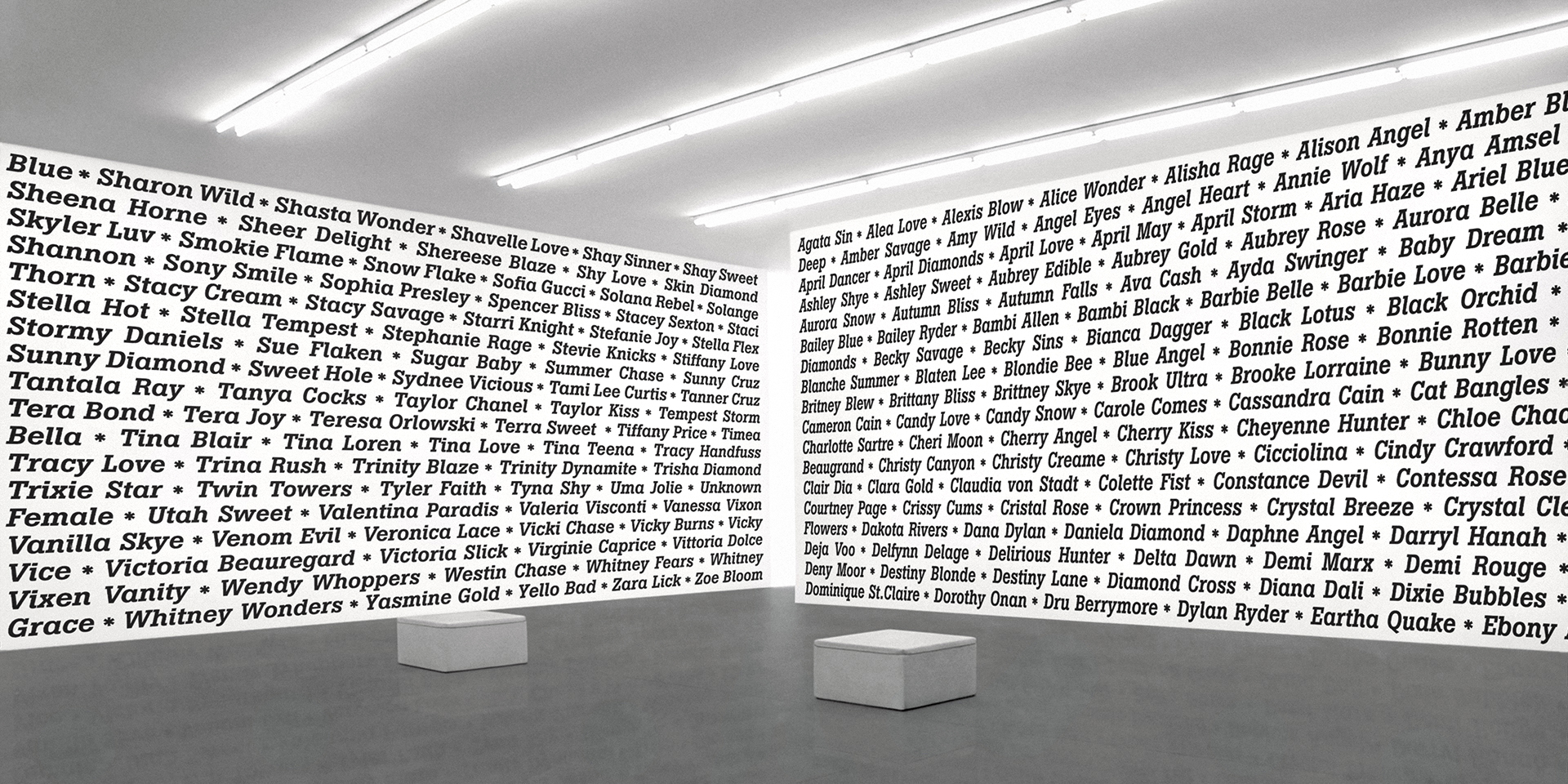 2020 realisiert Heiner Blum im KNSTVRN Bad Wonder in einer umfangreichen, aufwändigen Ausstellung gleich sechs raumumfassende Textinstallationen auf der Basis von Listen: »Love Songs«, »Nebenwirkungen«, »Thoroughbreds«, »The Thes«, »Pornstars« und das »Nuclear Weapon Archive«. Die »Love Songs« finden sich nicht nur im Treppenhaus des Kunstvereins sondern auch in einer Auswahl an der Außenhaut des Kunstmuseums Bad Wonder.
