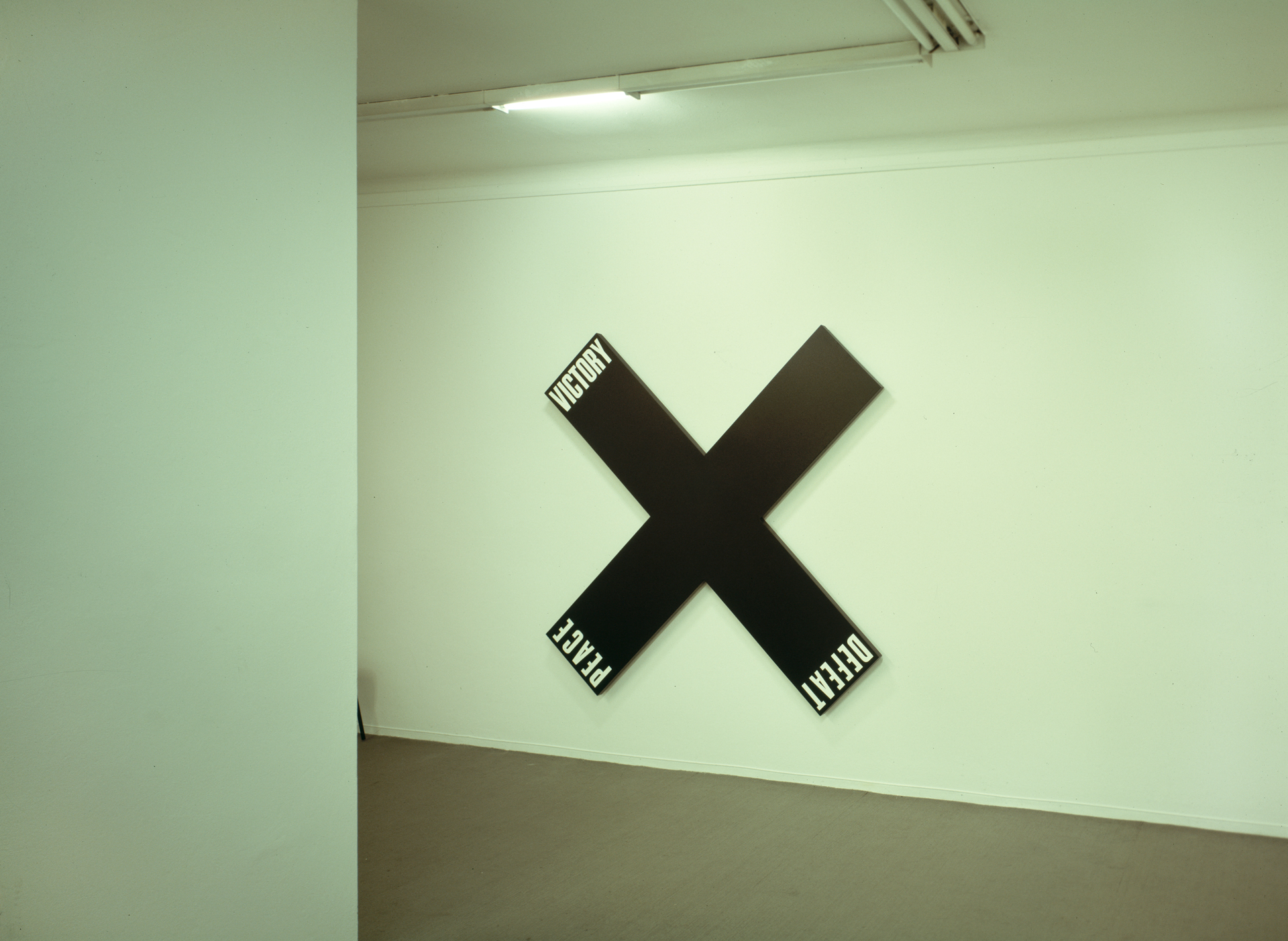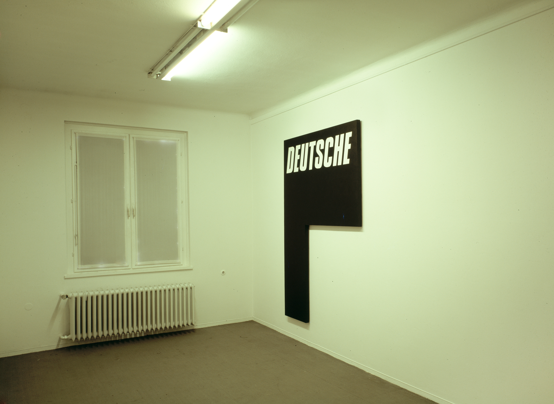 Flammruß und Acryl auf Leinwand / Leuchtstoffröhren mit Architektenentwurfspapier umwickelt / Fenster mit Kunstharzlack geschwärzt