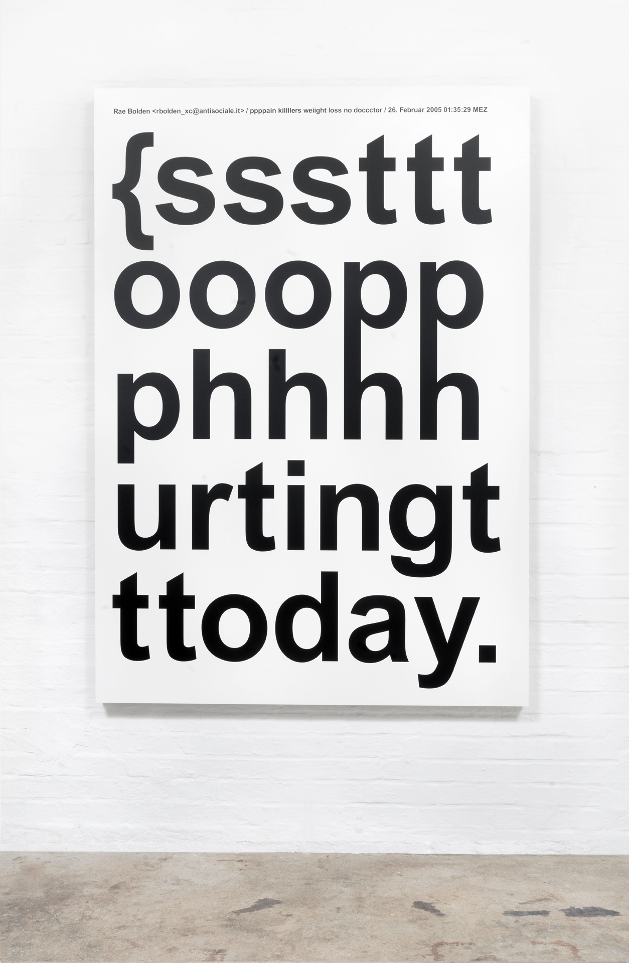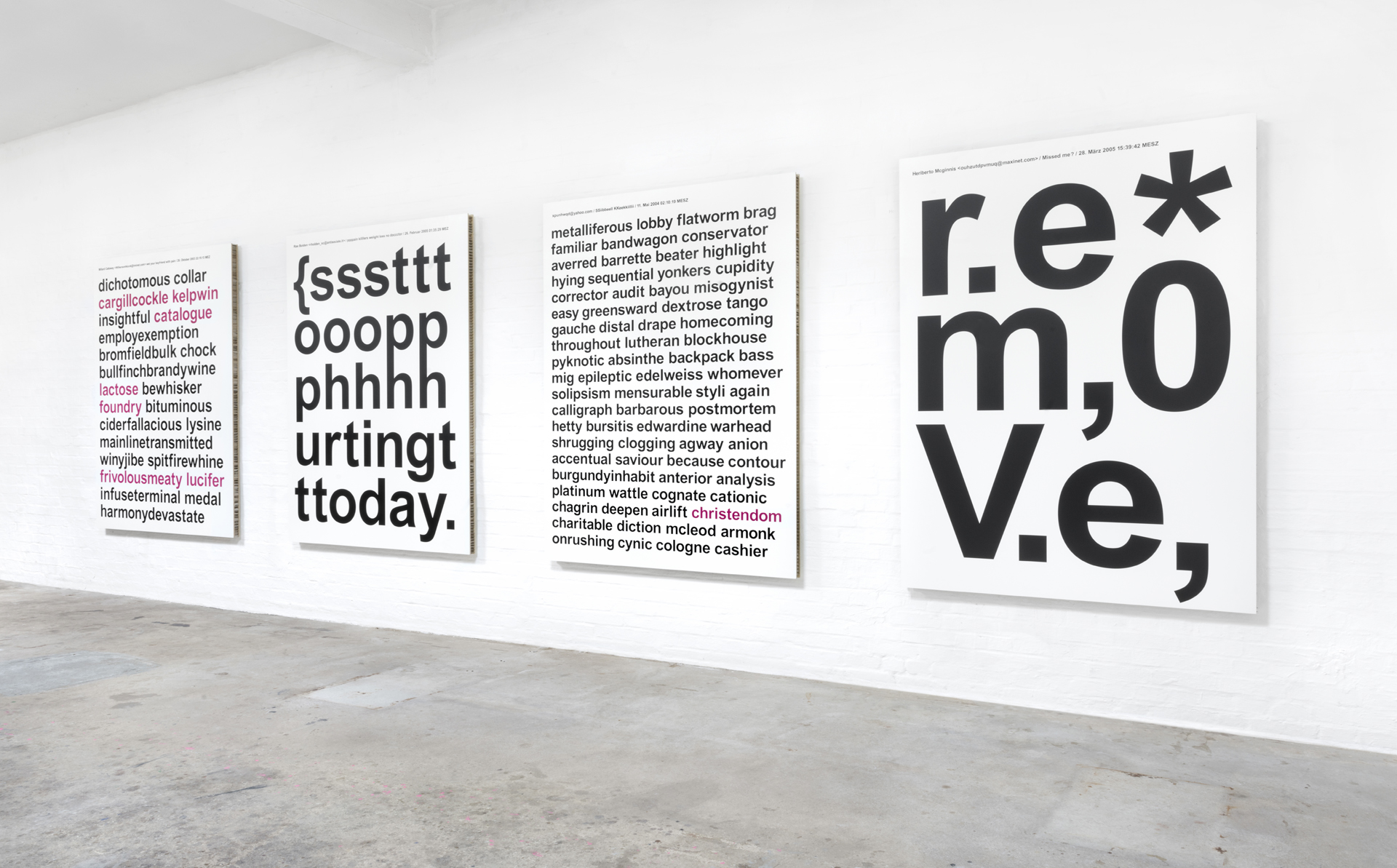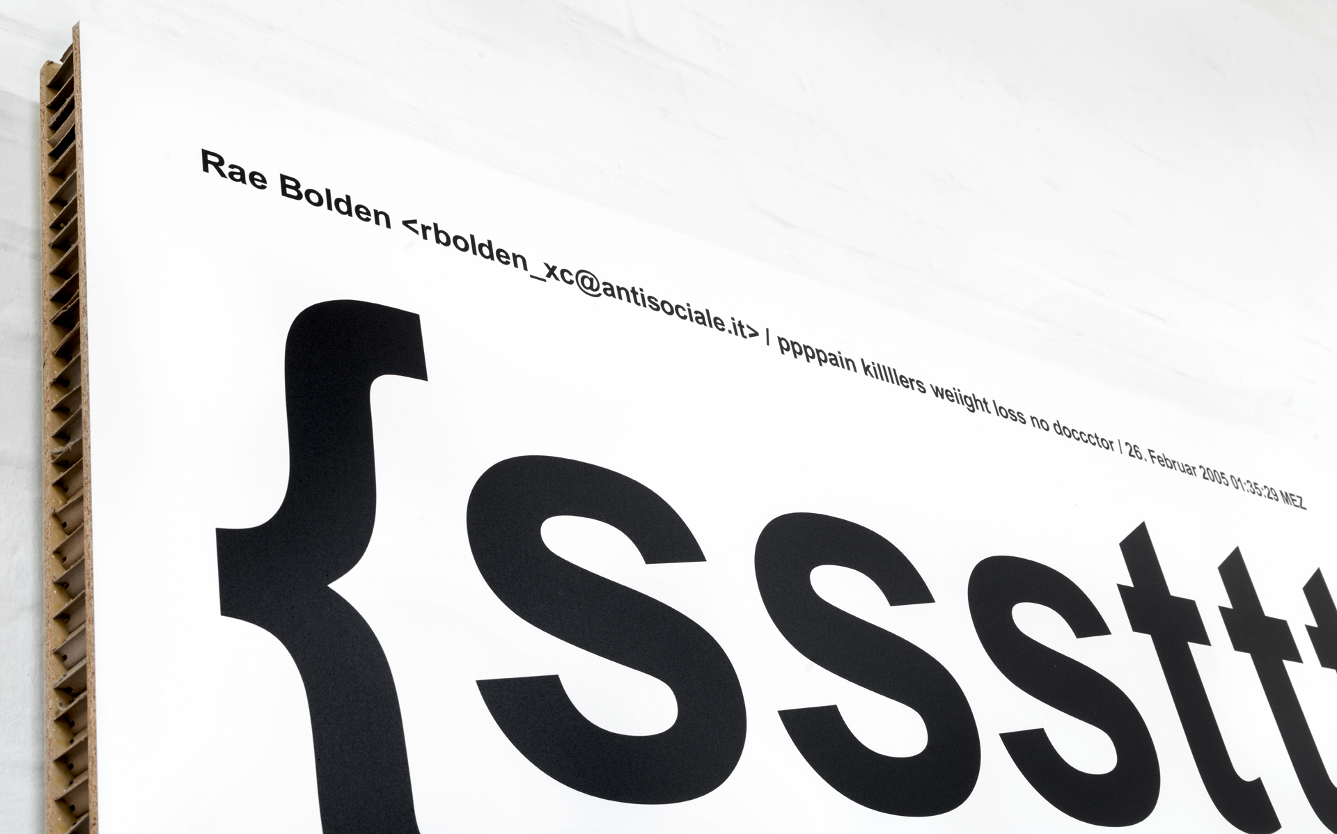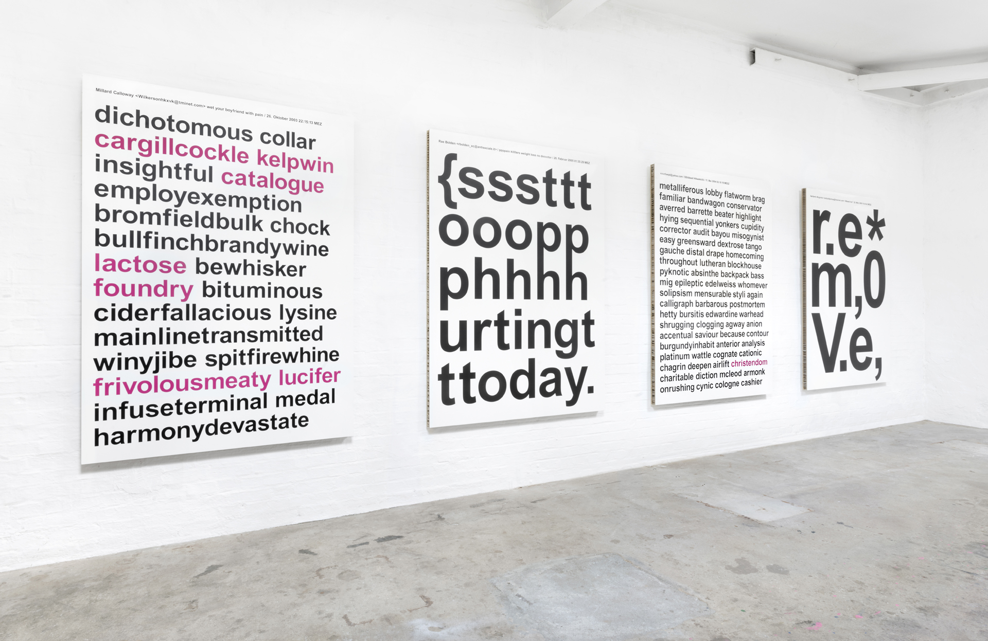 Aus einer umfassenden, langjährigen Sammlung von Spam entstehen großformatige Tafelbilder. Die typografischen Botschaften werden im UV-Druck auf Leichtbauplatten mit Wabenkern im Format von 150 x 210 x 5 cm übertragen.