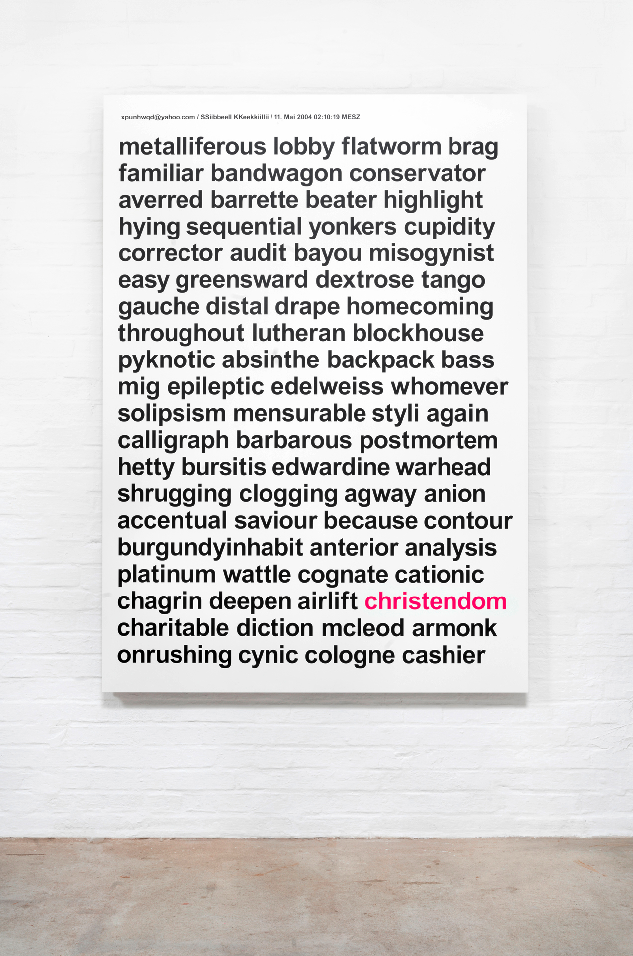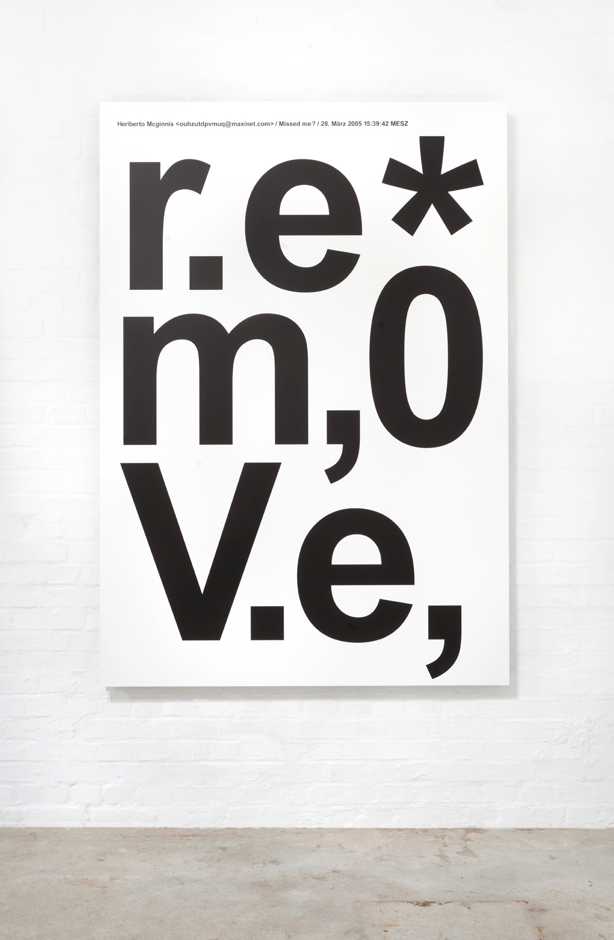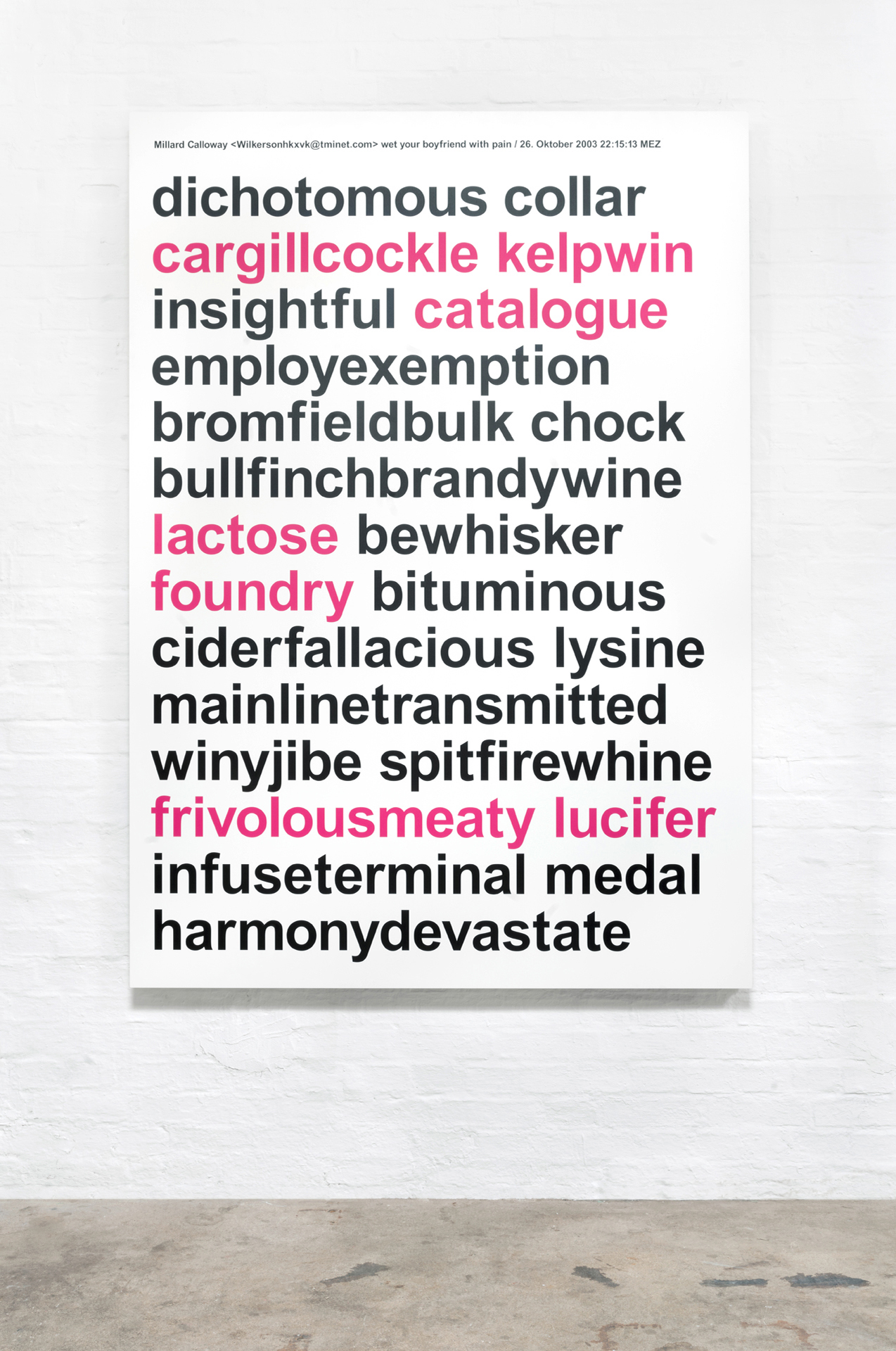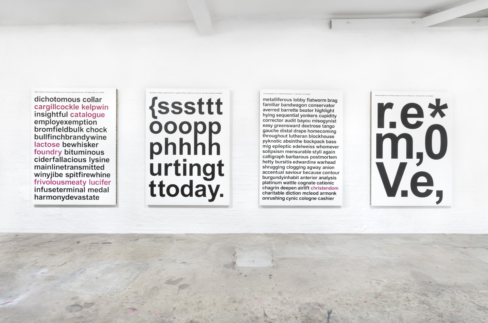 Aus einer umfassenden, langjährigen Sammlung von Spam entstehen großformatige Tafelbilder. Die typografischen Botschaften werden im UV-Druck auf Leichtbauplatten mit Wabenkern im Format von 150 x 210 x 5 cm übertragen.