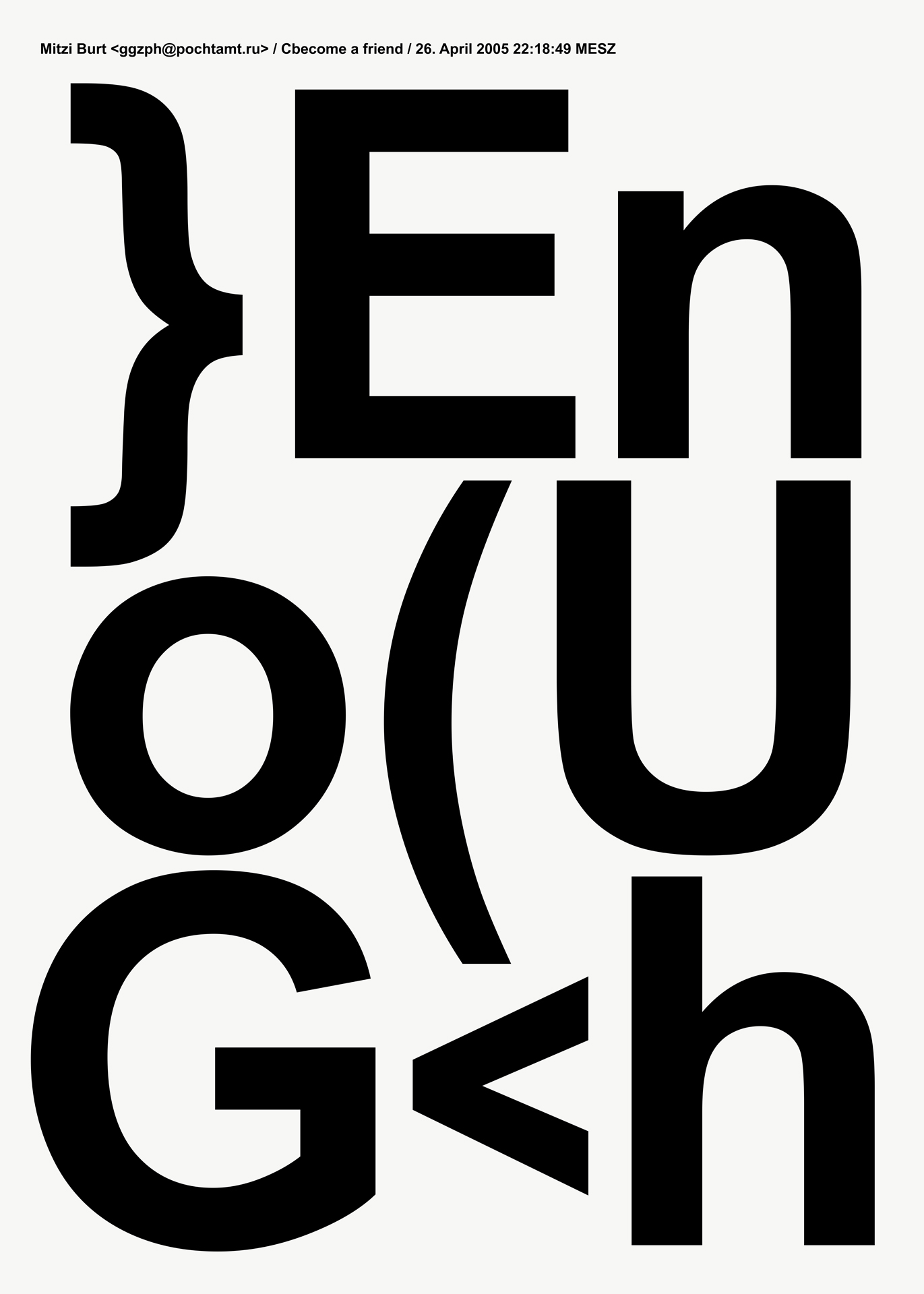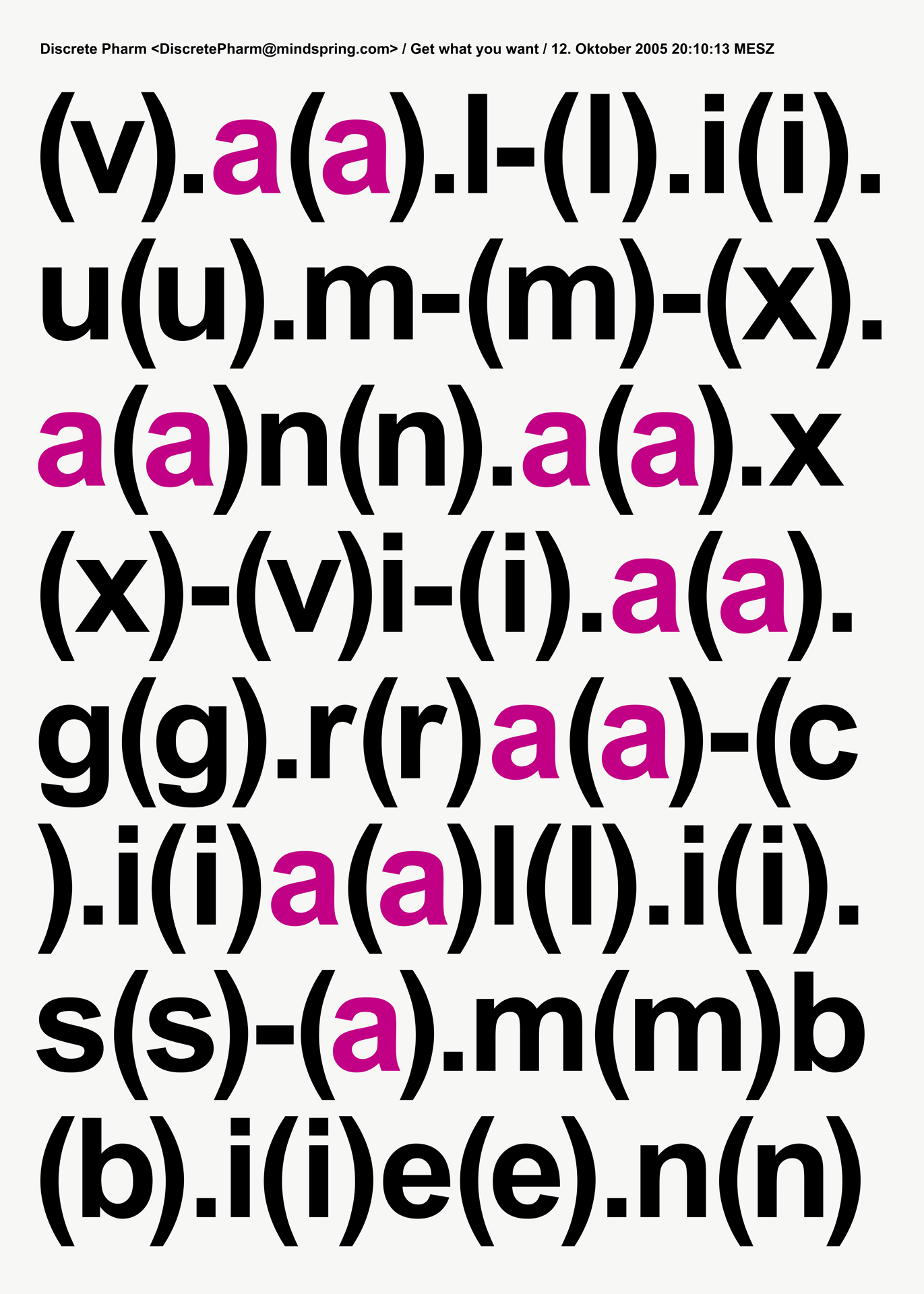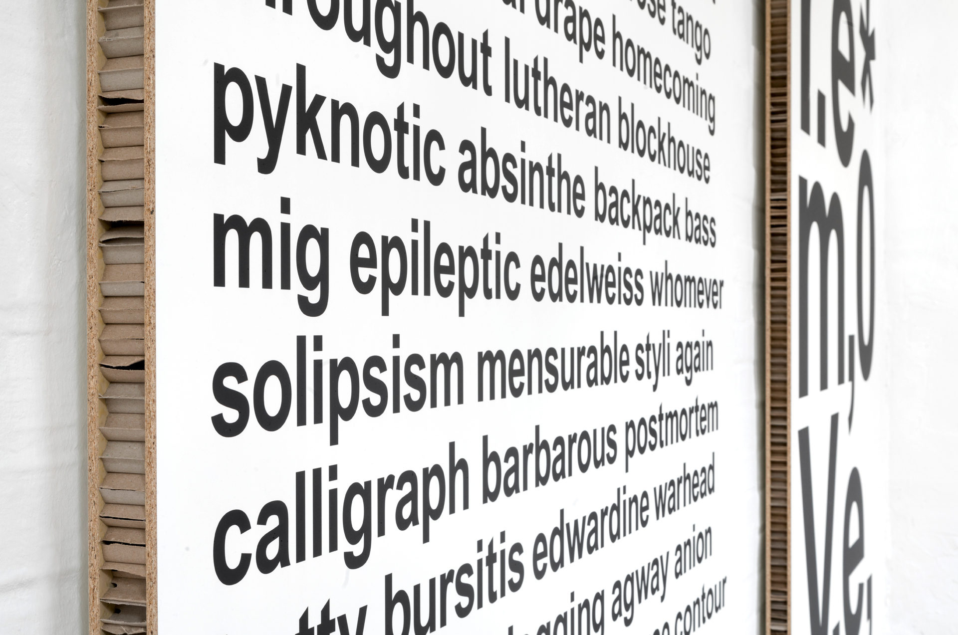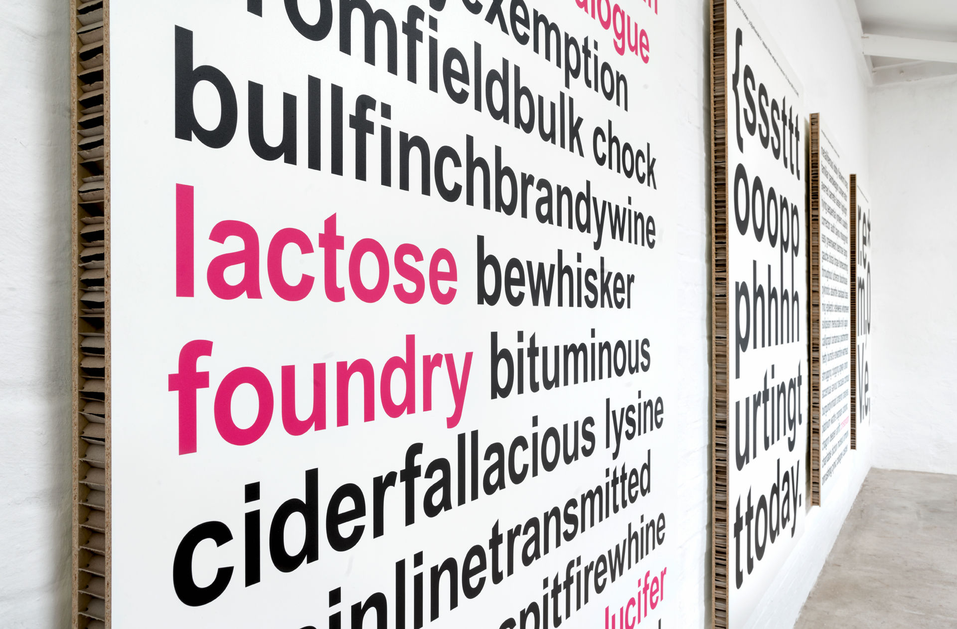 Aus einer umfassenden, langjährigen Sammlung von Spam entstehen großformatige Tafelbilder. Die typografischen Botschaften werden im UV-Druck auf Leichtbauplatten mit Wabenkern im Format von 150 x 210 x 5 cm übertragen.
